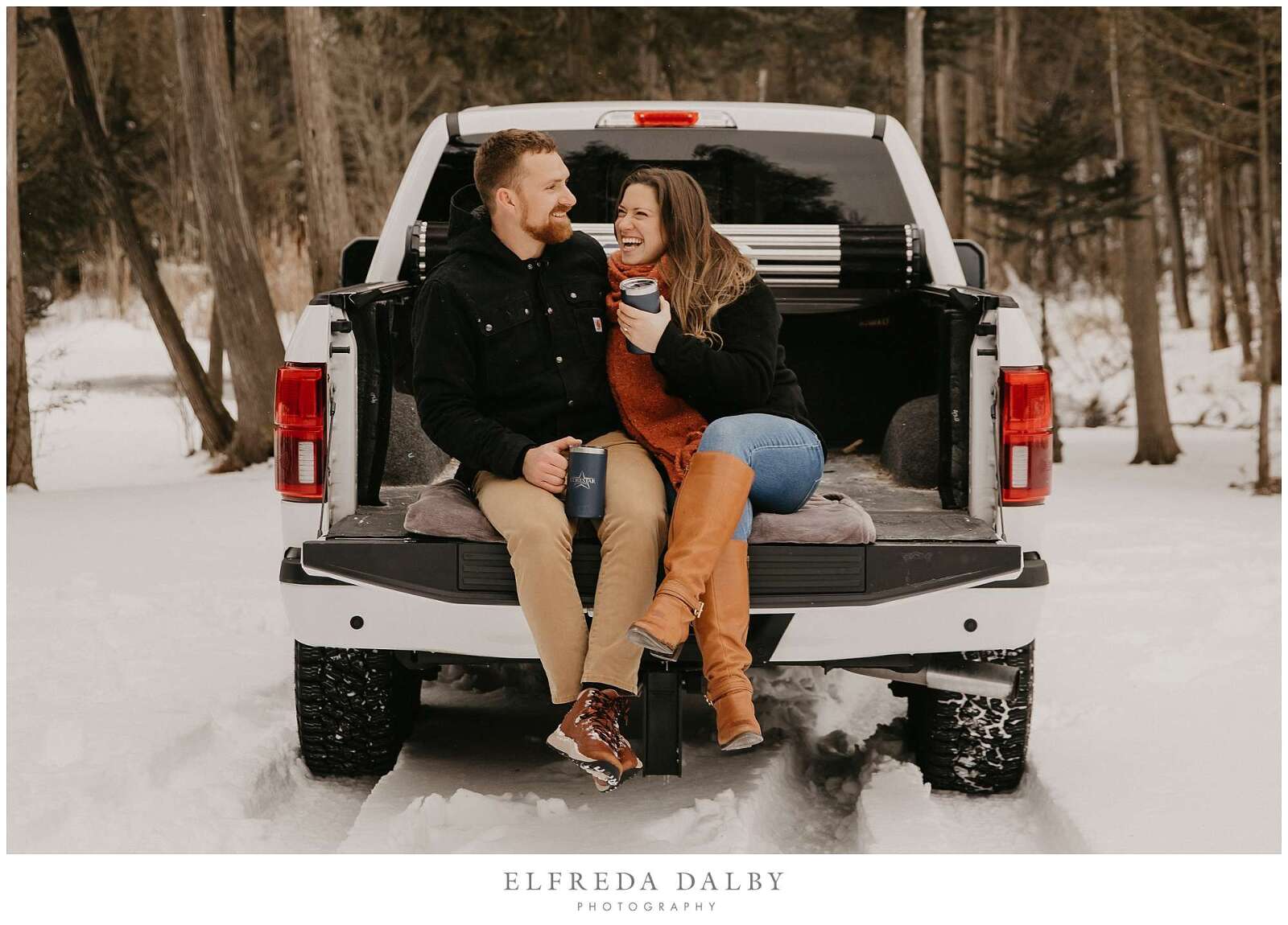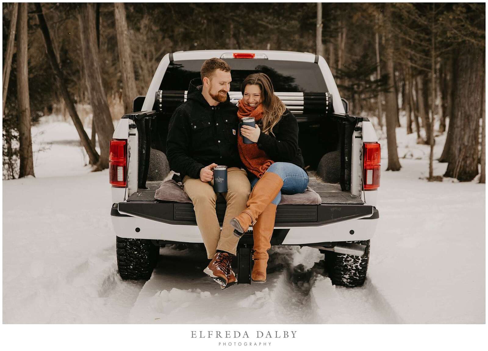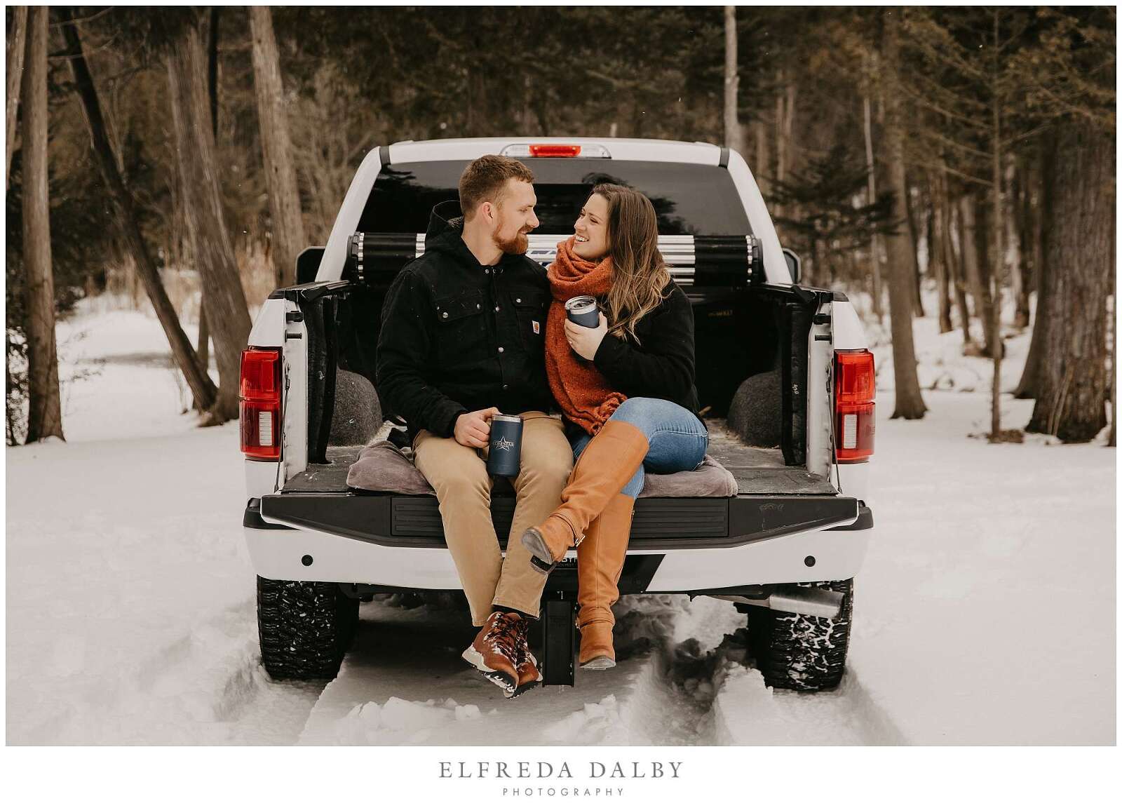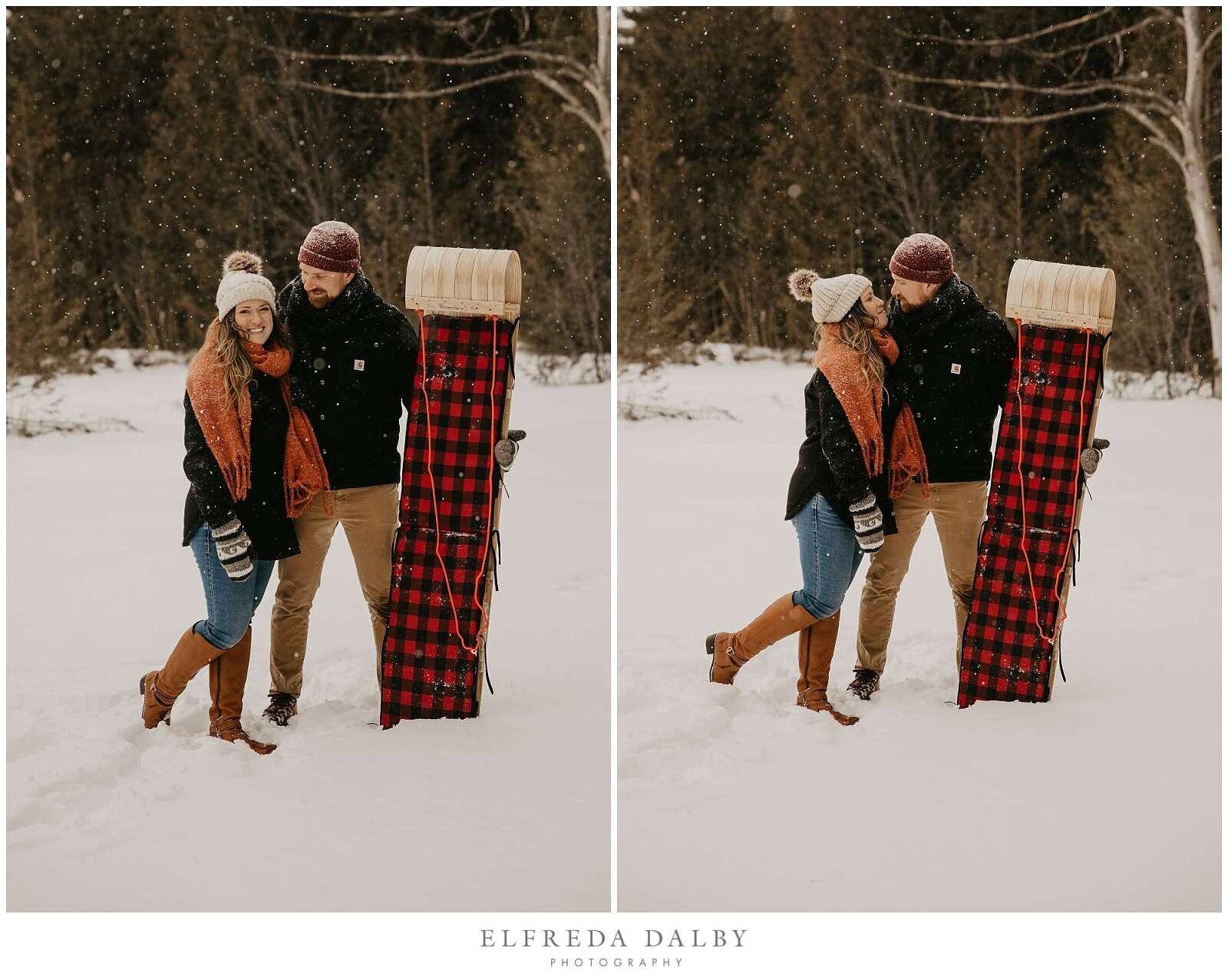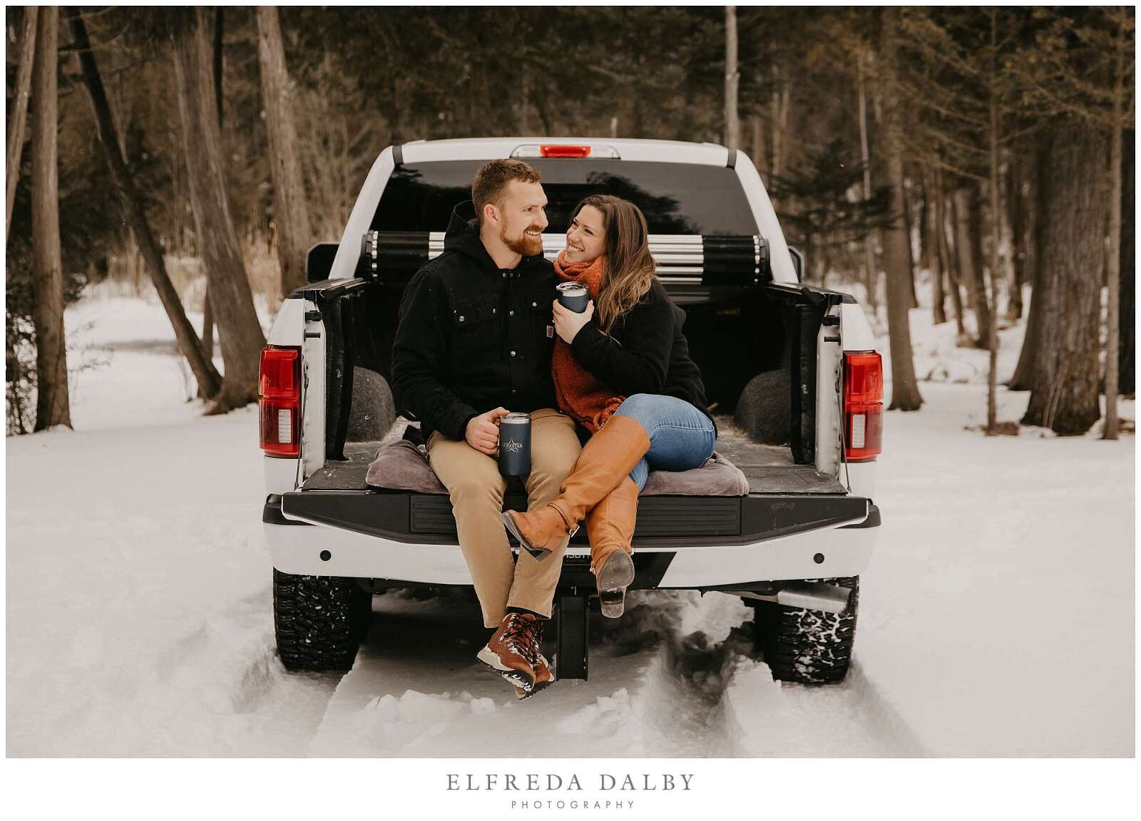 The forest provided a peaceful setting and a cozy fee. Especially when they enjoyed some hot chocolate in the back of the pick-up truck. They also brought a beautiful wooden toboggan to have some fun on in the snow. This couple clearly loves the outdoors as much as we do.