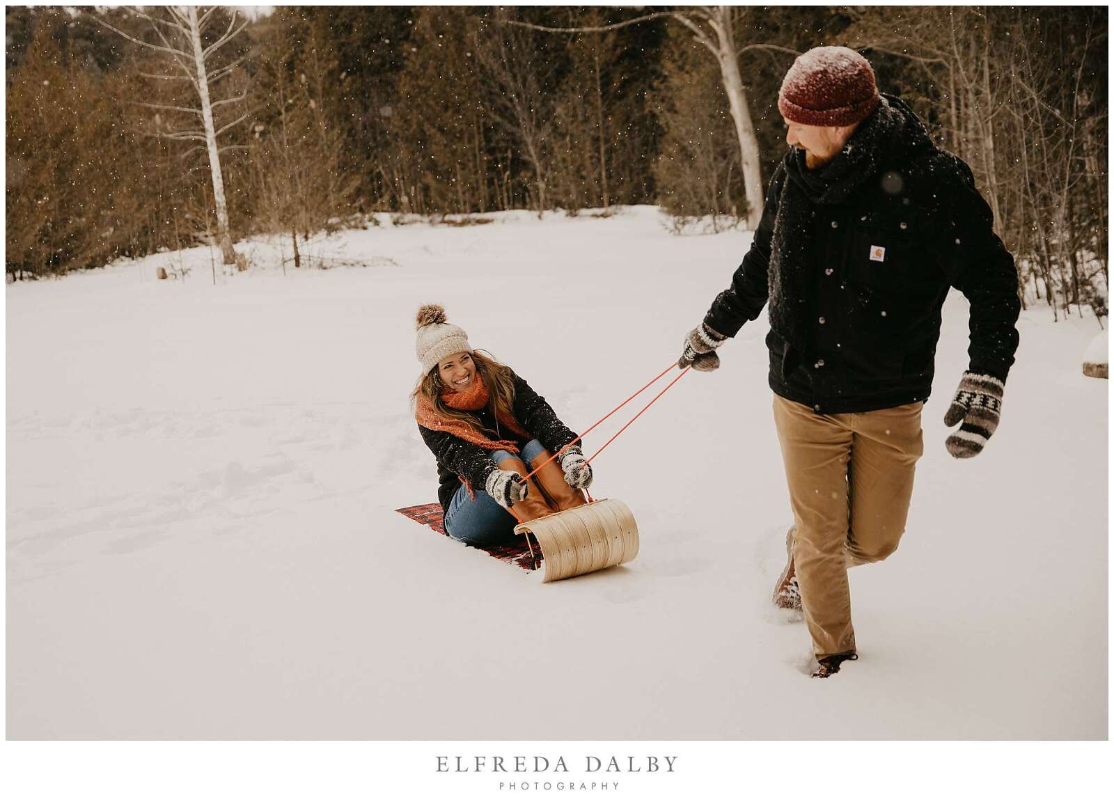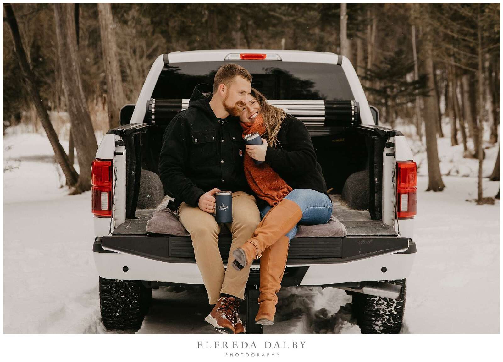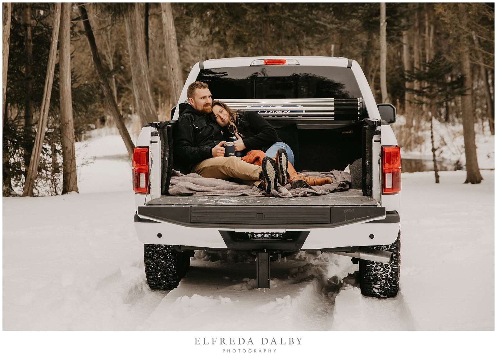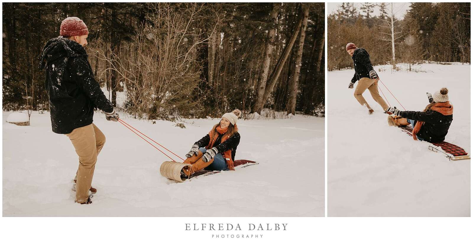 The forest provided a peaceful setting and a cozy fee. Especially when they enjoyed some hot chocolate in the back of the pick-up truck. They also brought a beautiful wooden toboggan to have some fun on in the snow. This couple clearly loves the outdoors as much as we do.