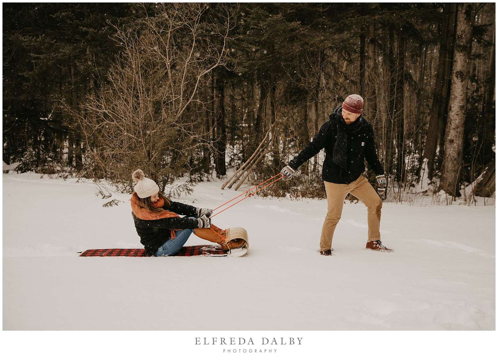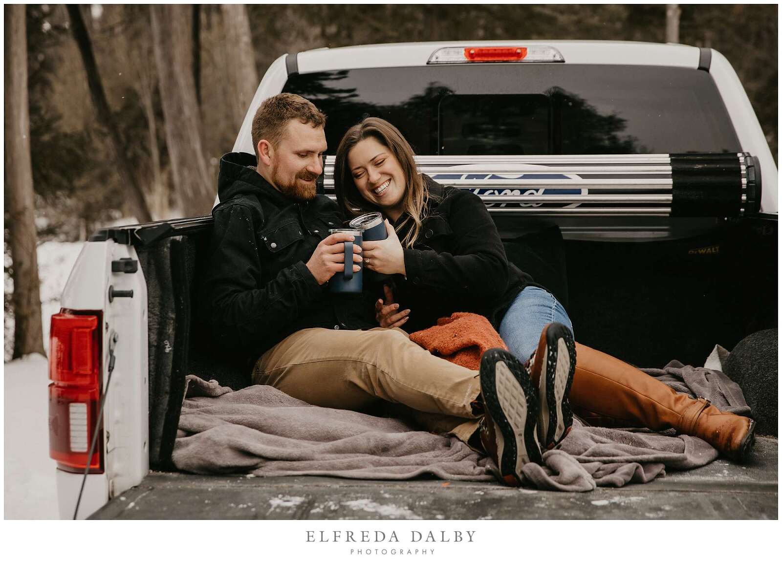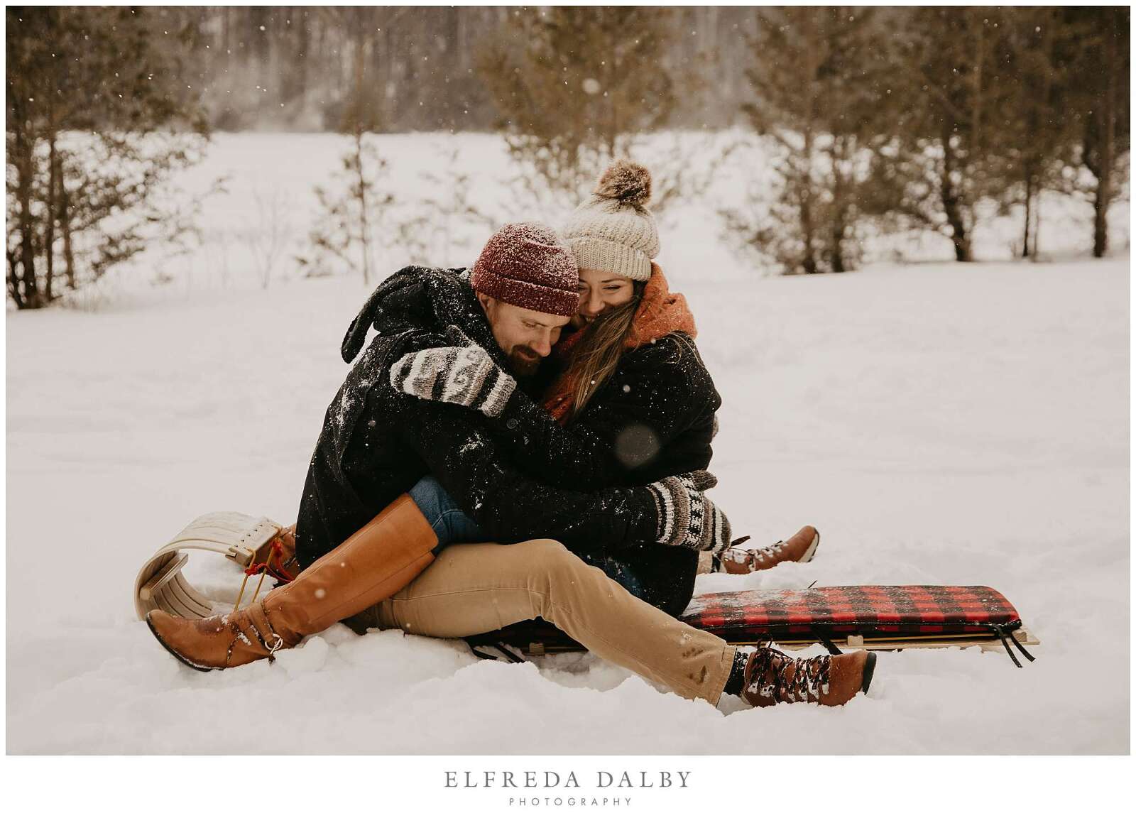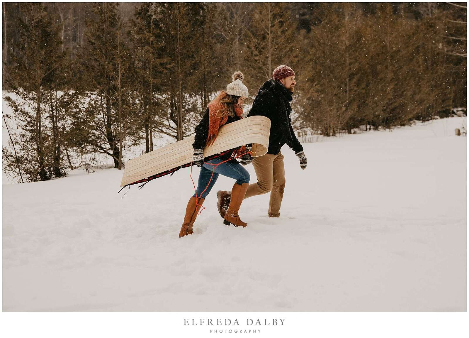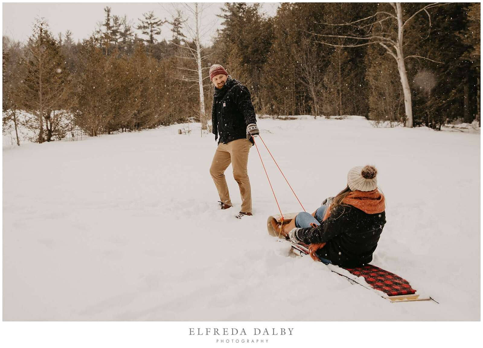 The forest provided a peaceful setting and a cozy fee. Especially when they enjoyed some hot chocolate in the back of the pick-up truck. They also brought a beautiful wooden toboggan to have some fun on in the snow. This couple clearly loves the outdoors as much as we do.