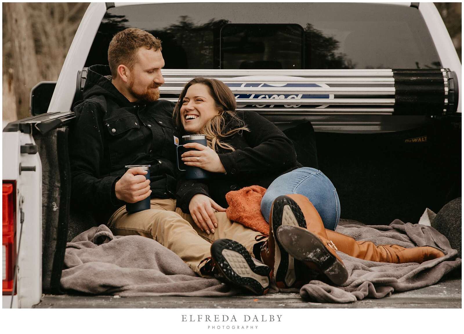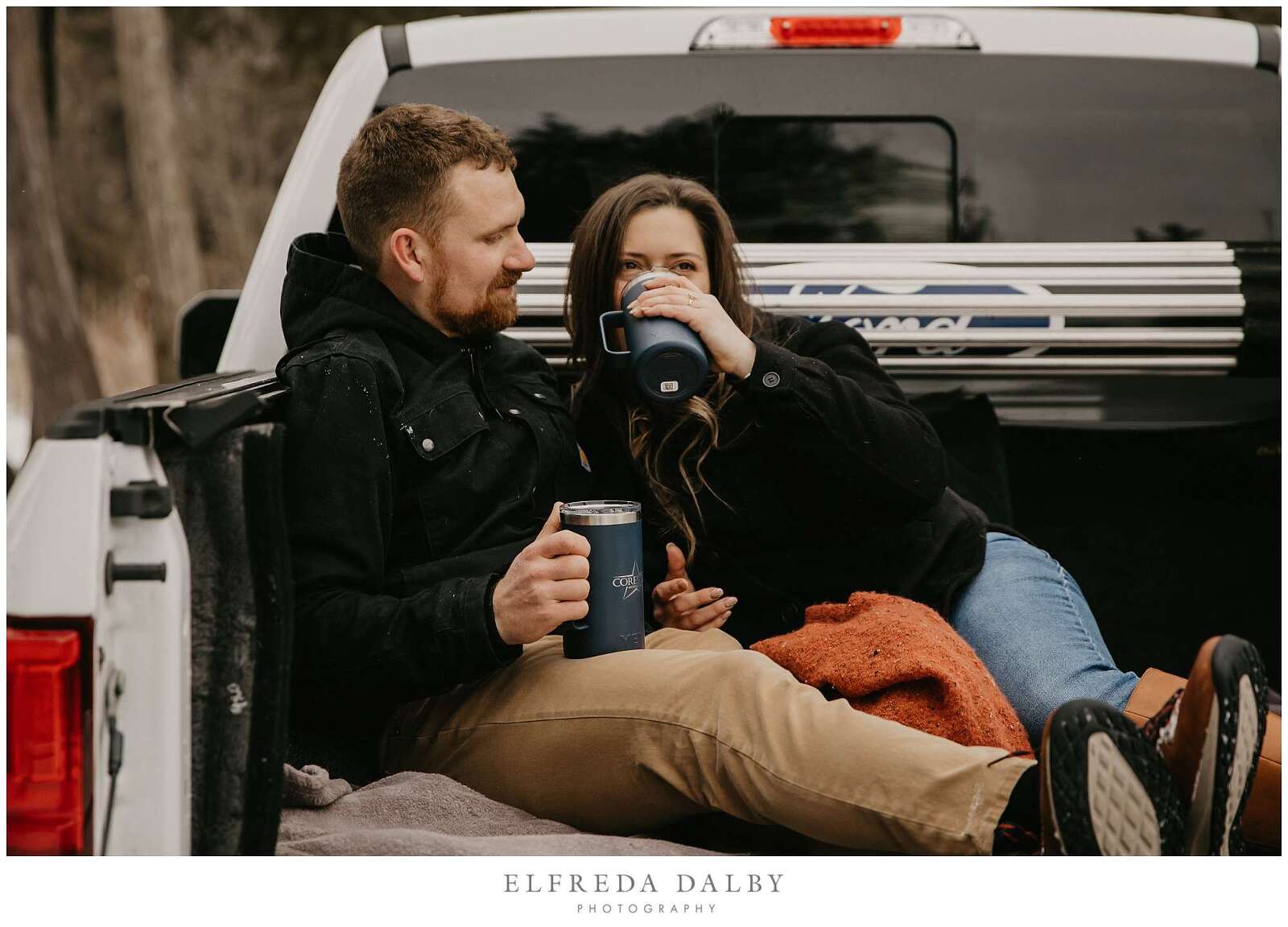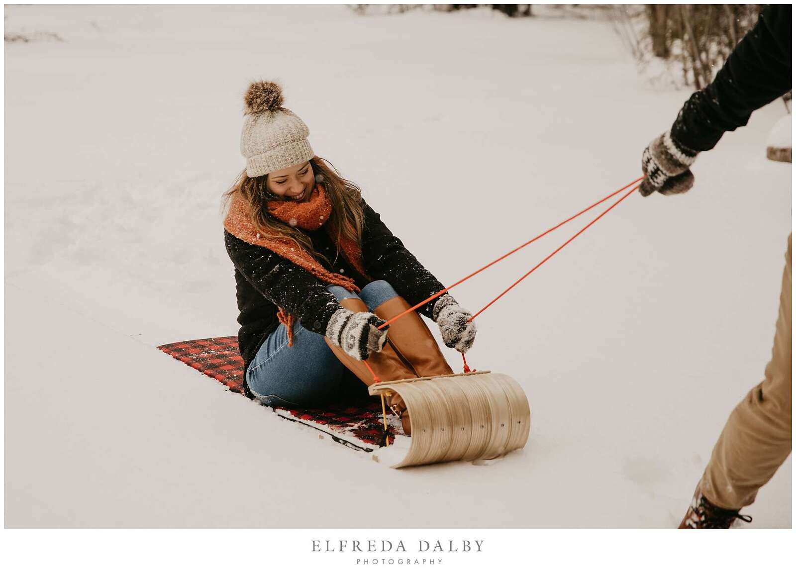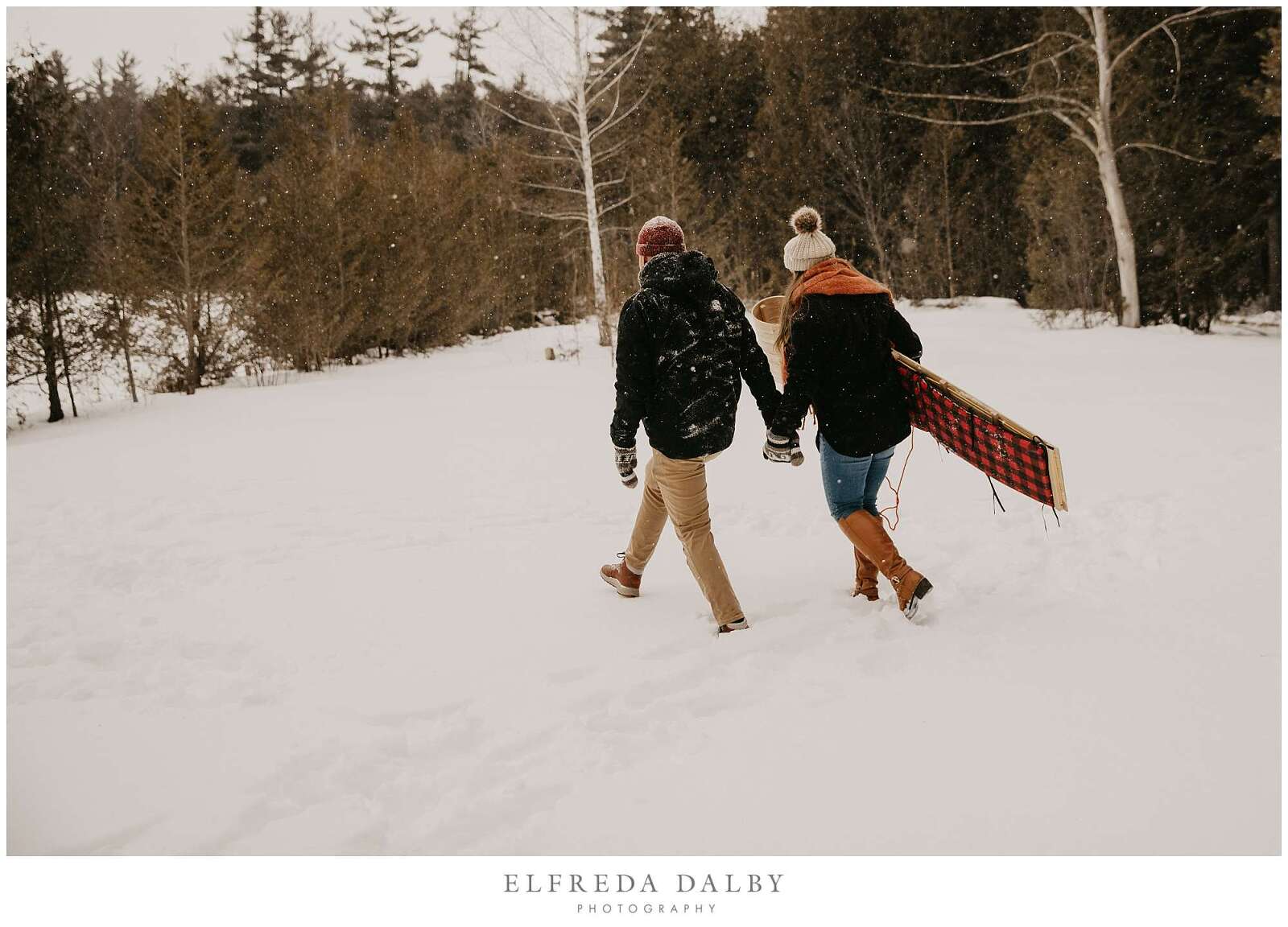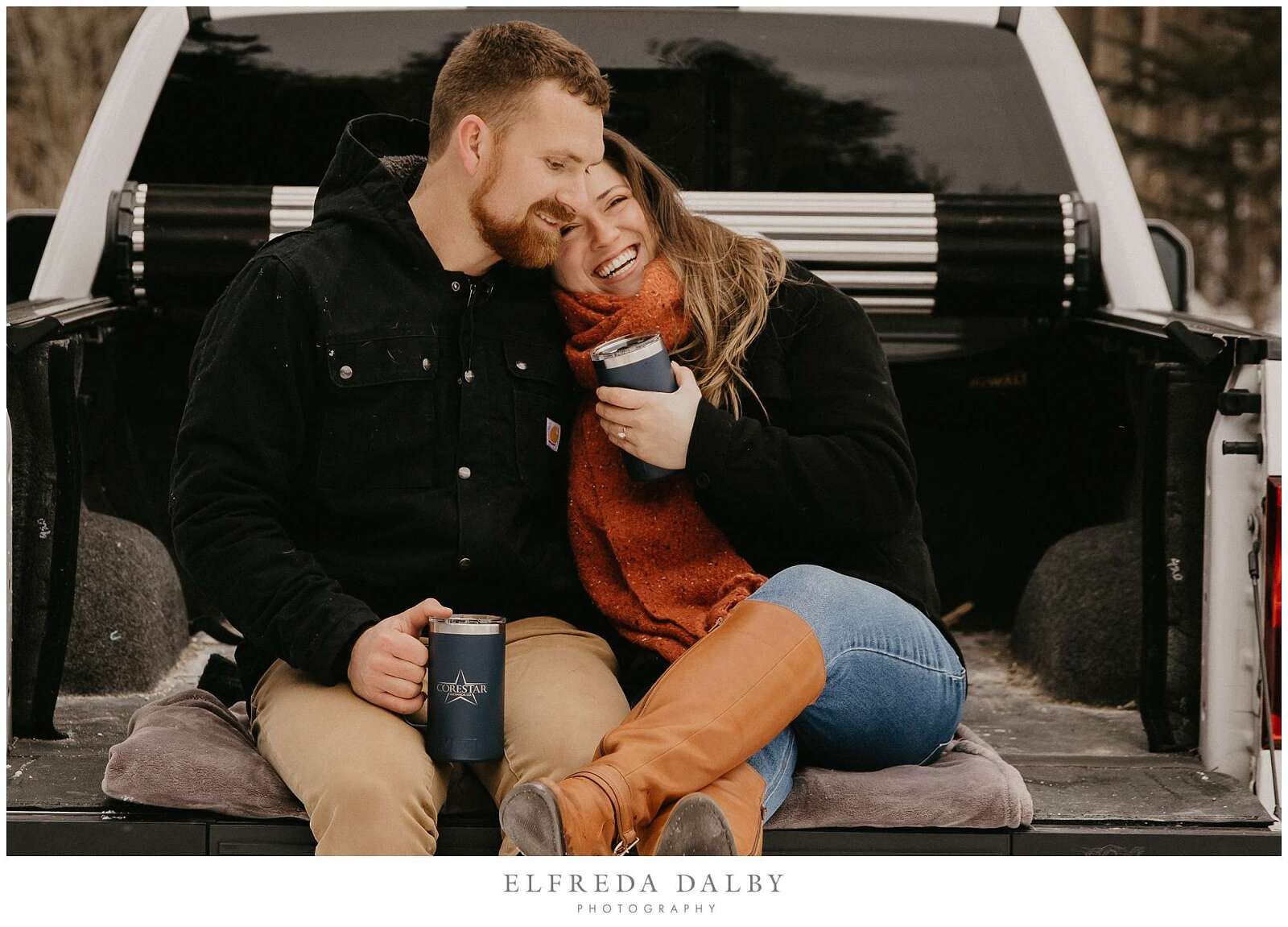 The forest provided a peaceful setting and a cozy fee. Especially when they enjoyed some hot chocolate in the back of the pick-up truck. They also brought a beautiful wooden toboggan to have some fun on in the snow. This couple clearly loves the outdoors as much as we do.