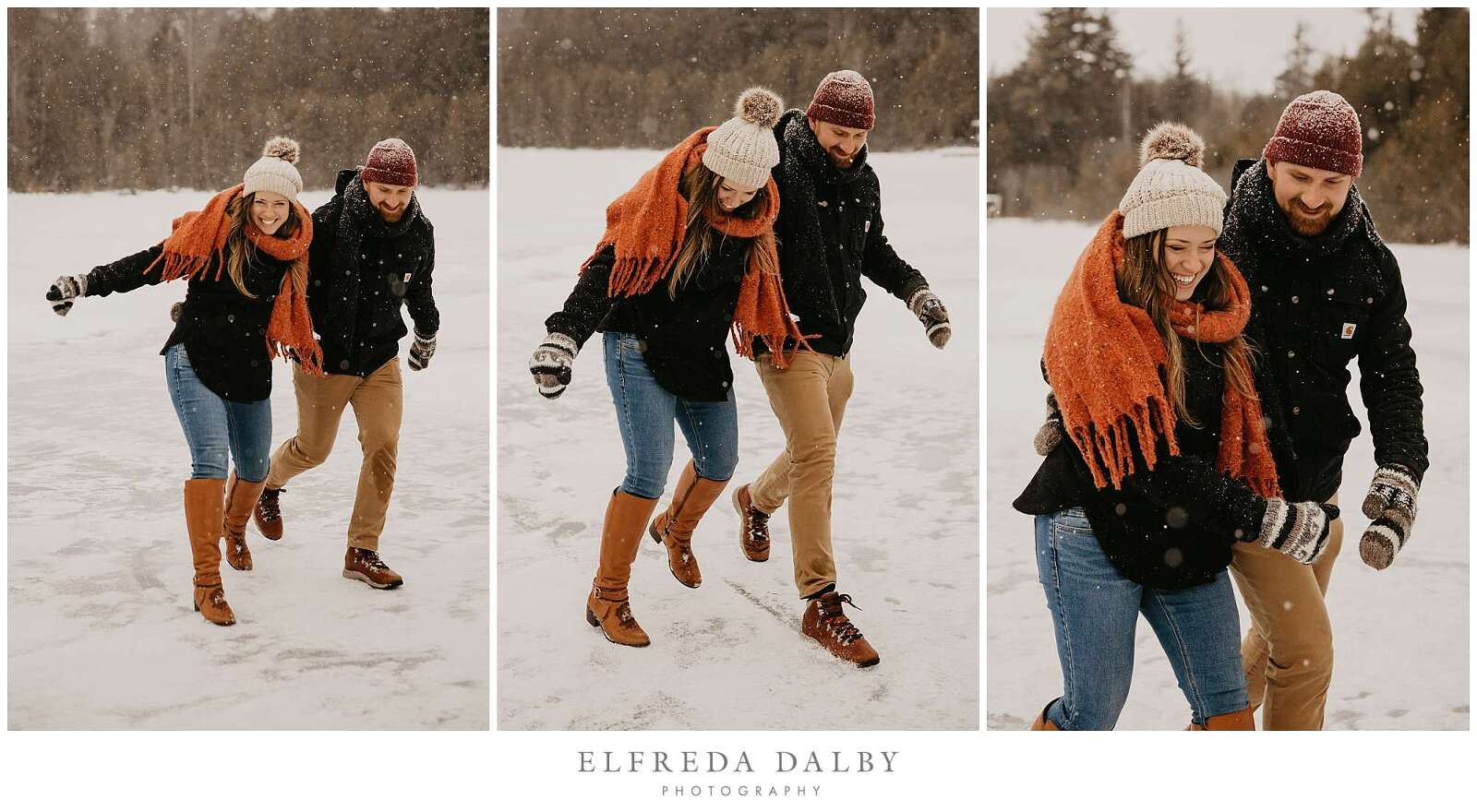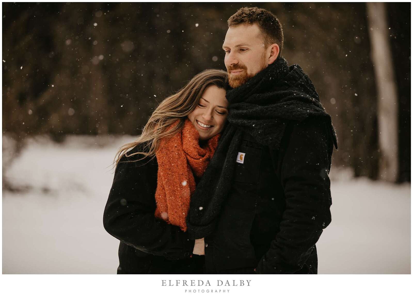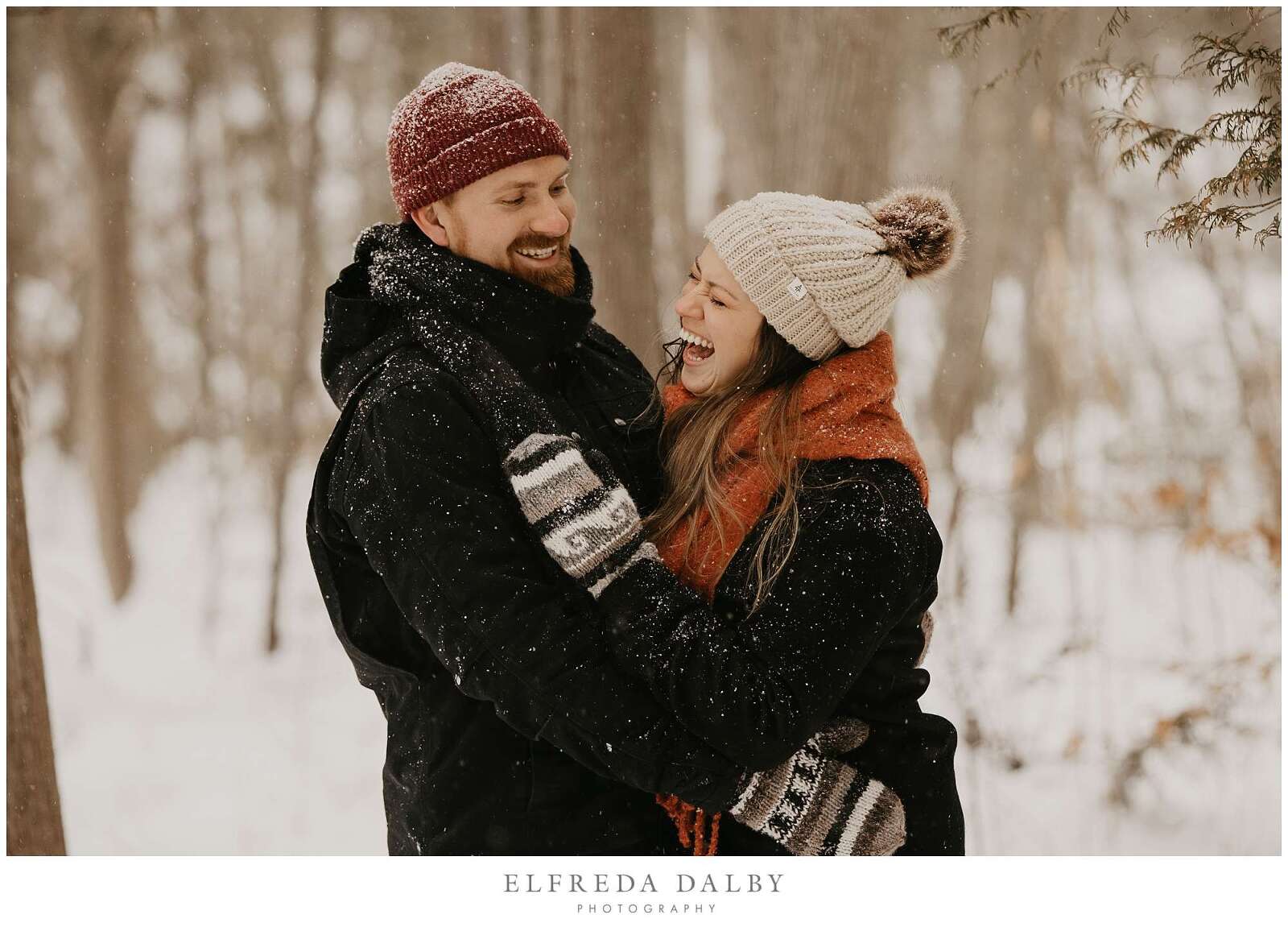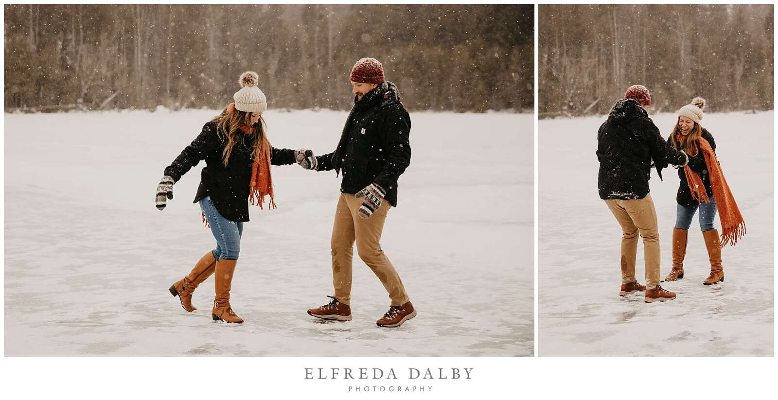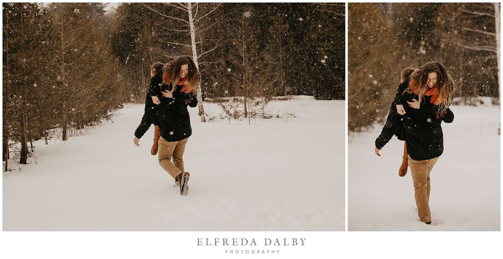As we started the shoot, flurries began to fall from the sky. It felt like the perfect moment for a romantic winter dream couple’s shoot. Rhian and Eric embraced the cold with joy. They played in the snow, letting their laughter fill the air. Their playfulness made it easy to capture real moments between this couple in love.