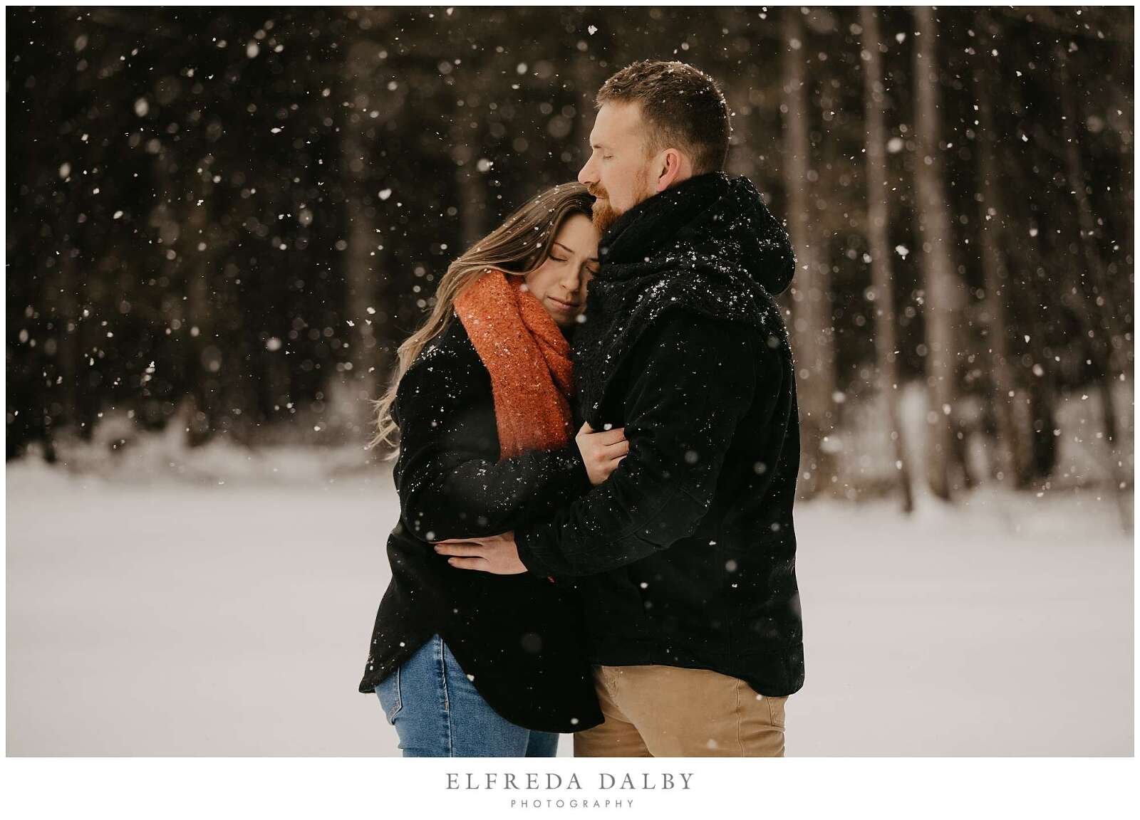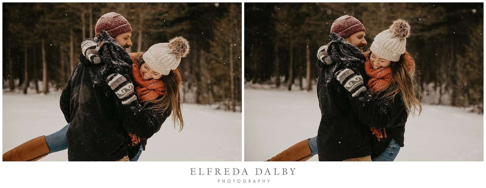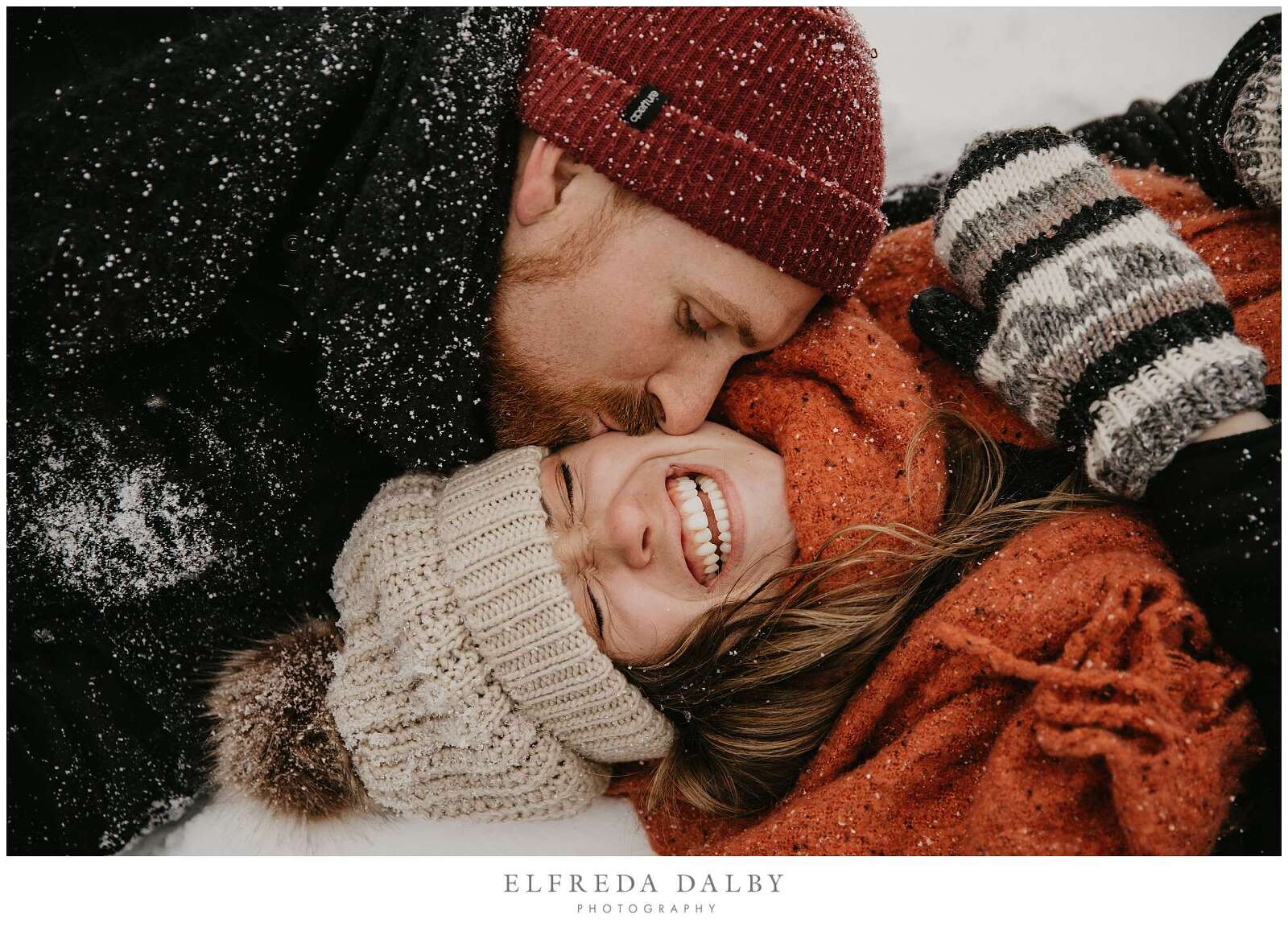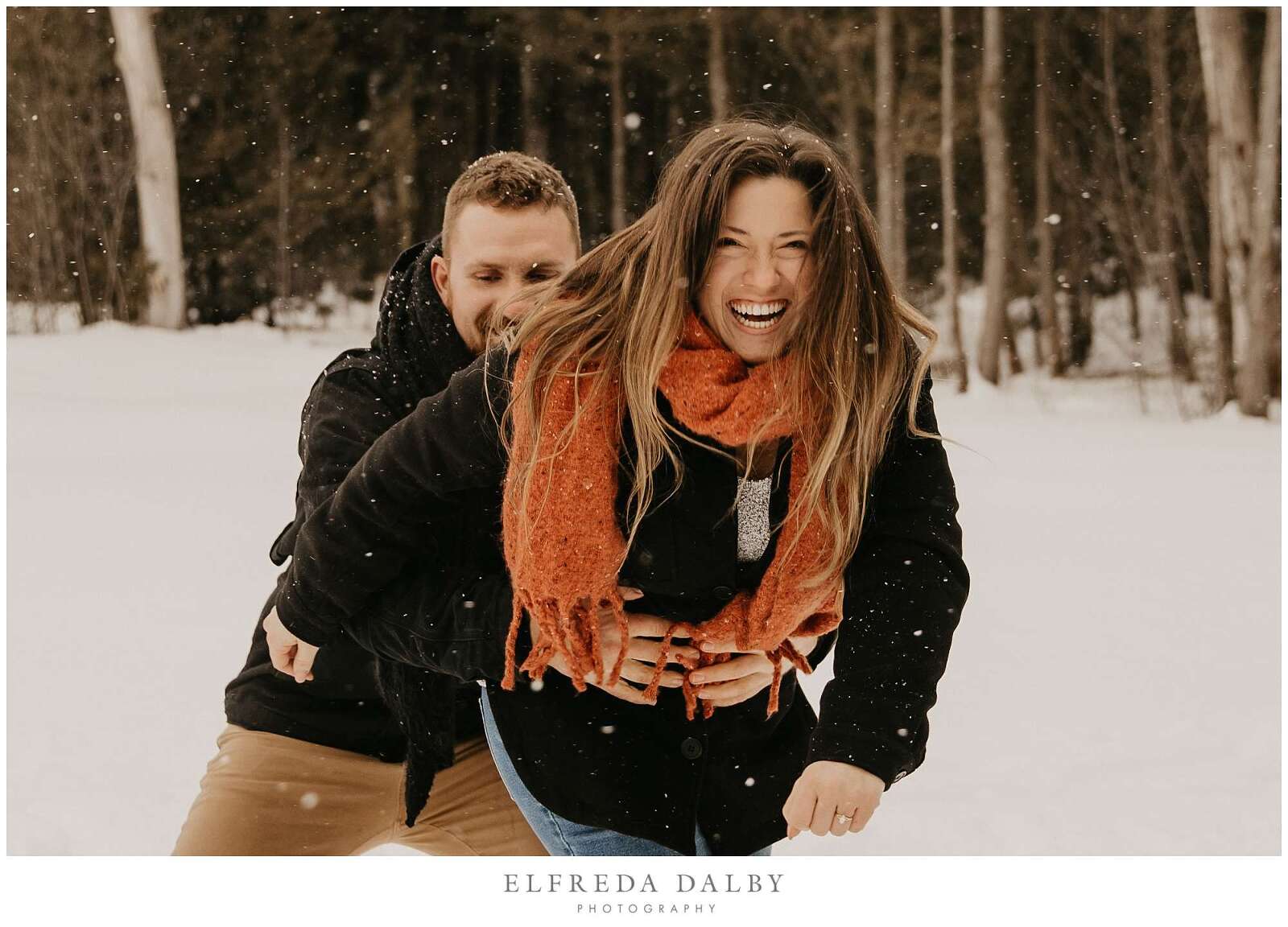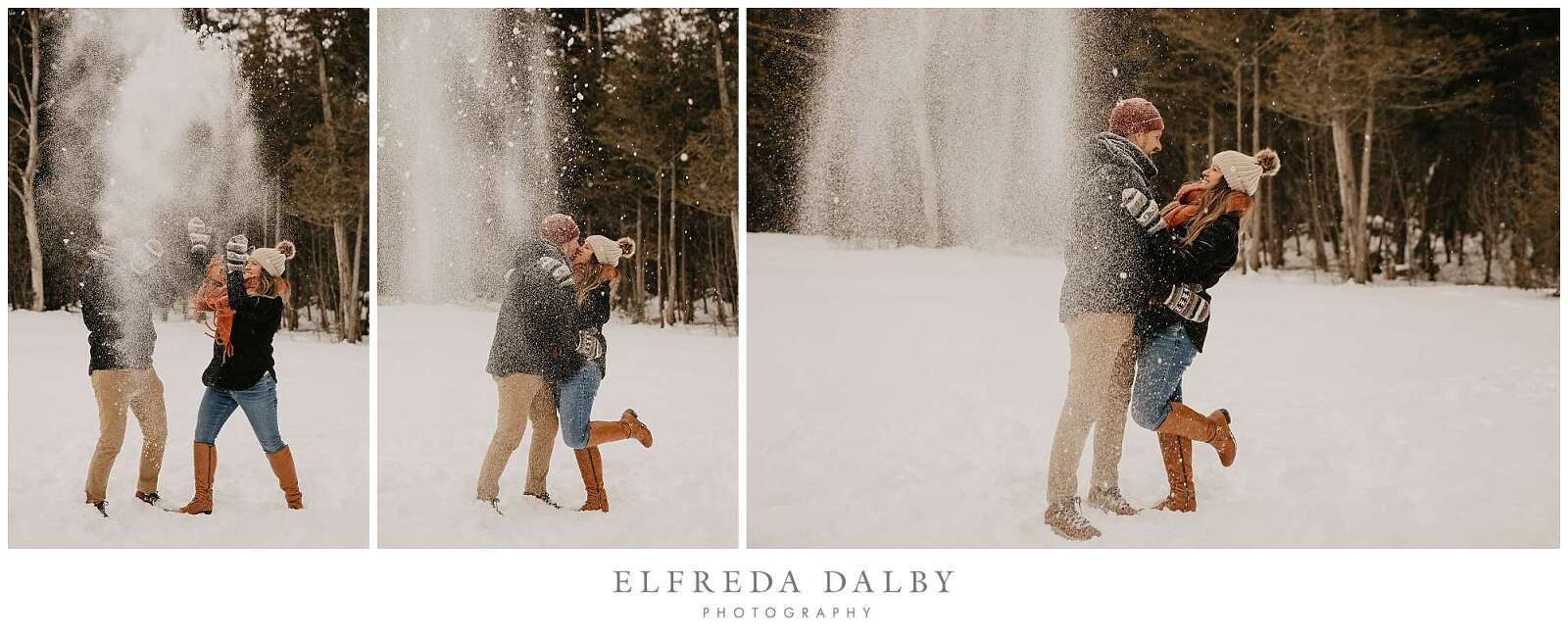 As we started the shoot, flurries began to fall from the sky. It felt like the perfect moment for a romantic winter dream couple’s shoot. Rhian and Eric embraced the cold with joy. They played in the snow, letting their laughter fill the air. Their playfulness made it easy to capture real moments between this couple in love.