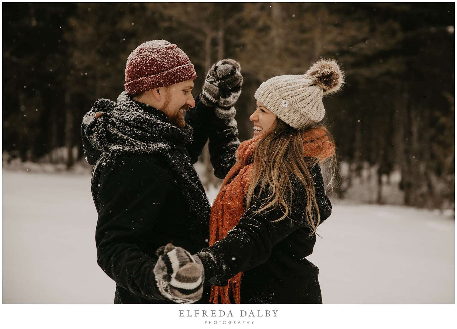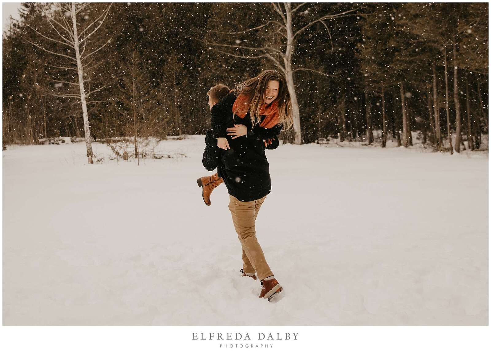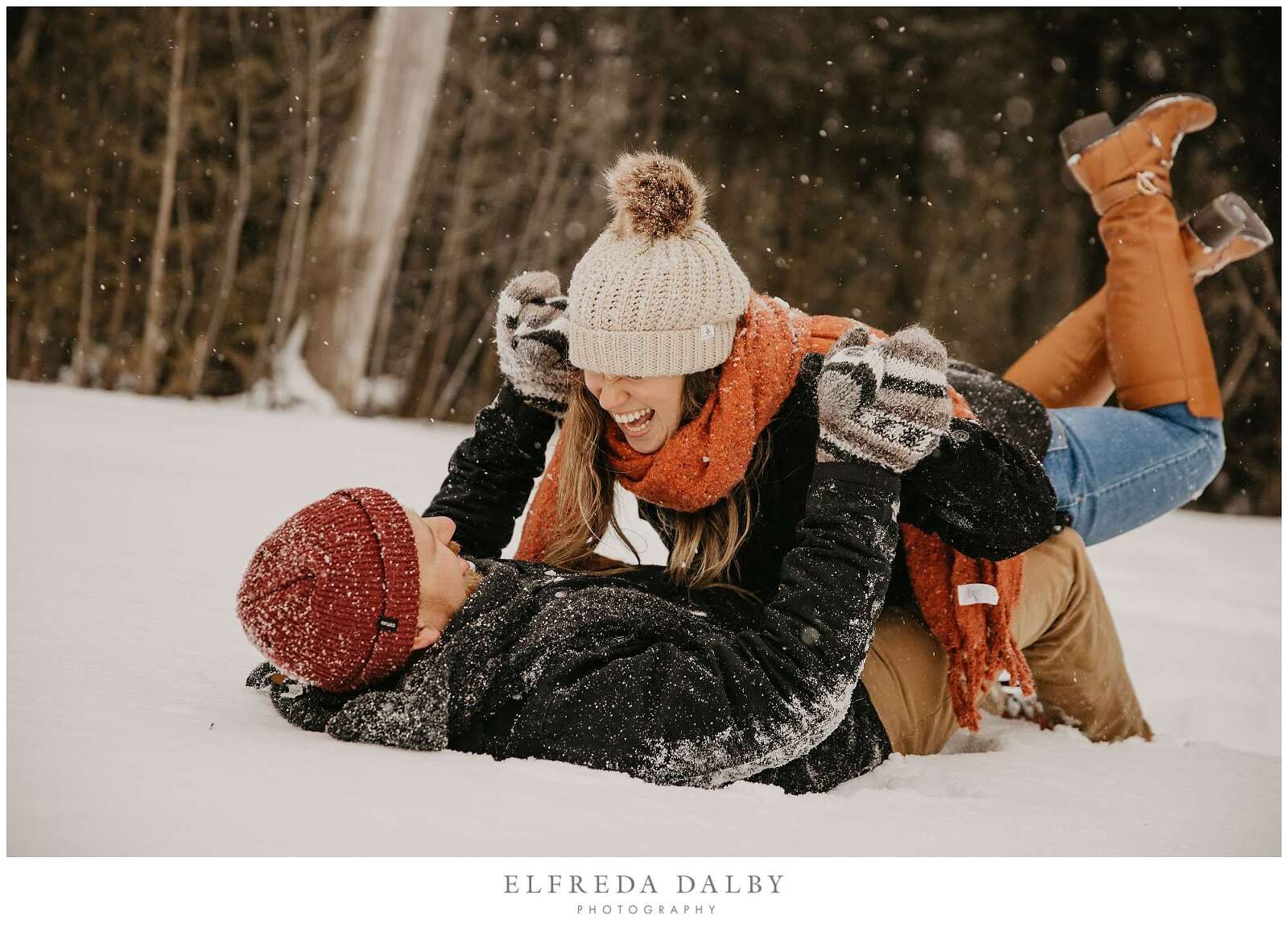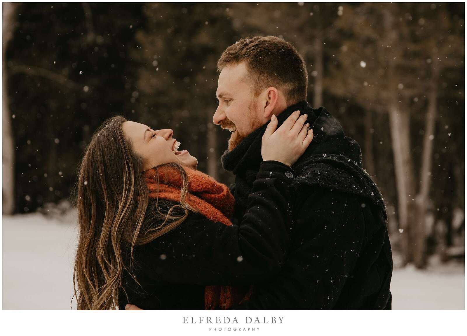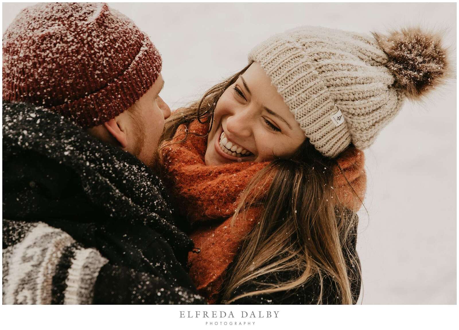 As we started the shoot, flurries began to fall from the sky. It felt like the perfect moment for a romantic winter dream couple’s shoot. Rhian and Eric embraced the cold with joy. They played in the snow, letting their laughter fill the air. Their playfulness made it easy to capture real moments between this couple in love.