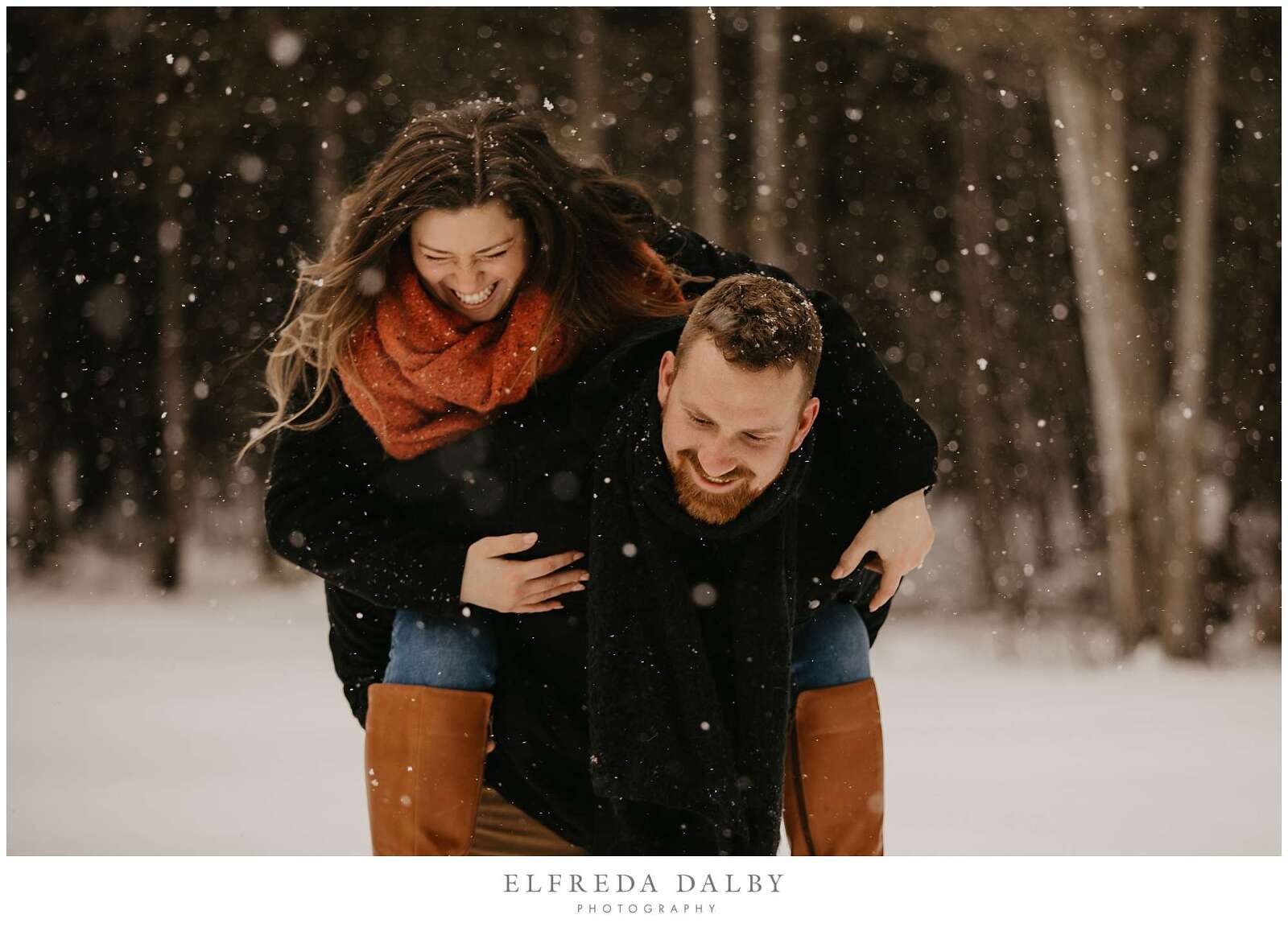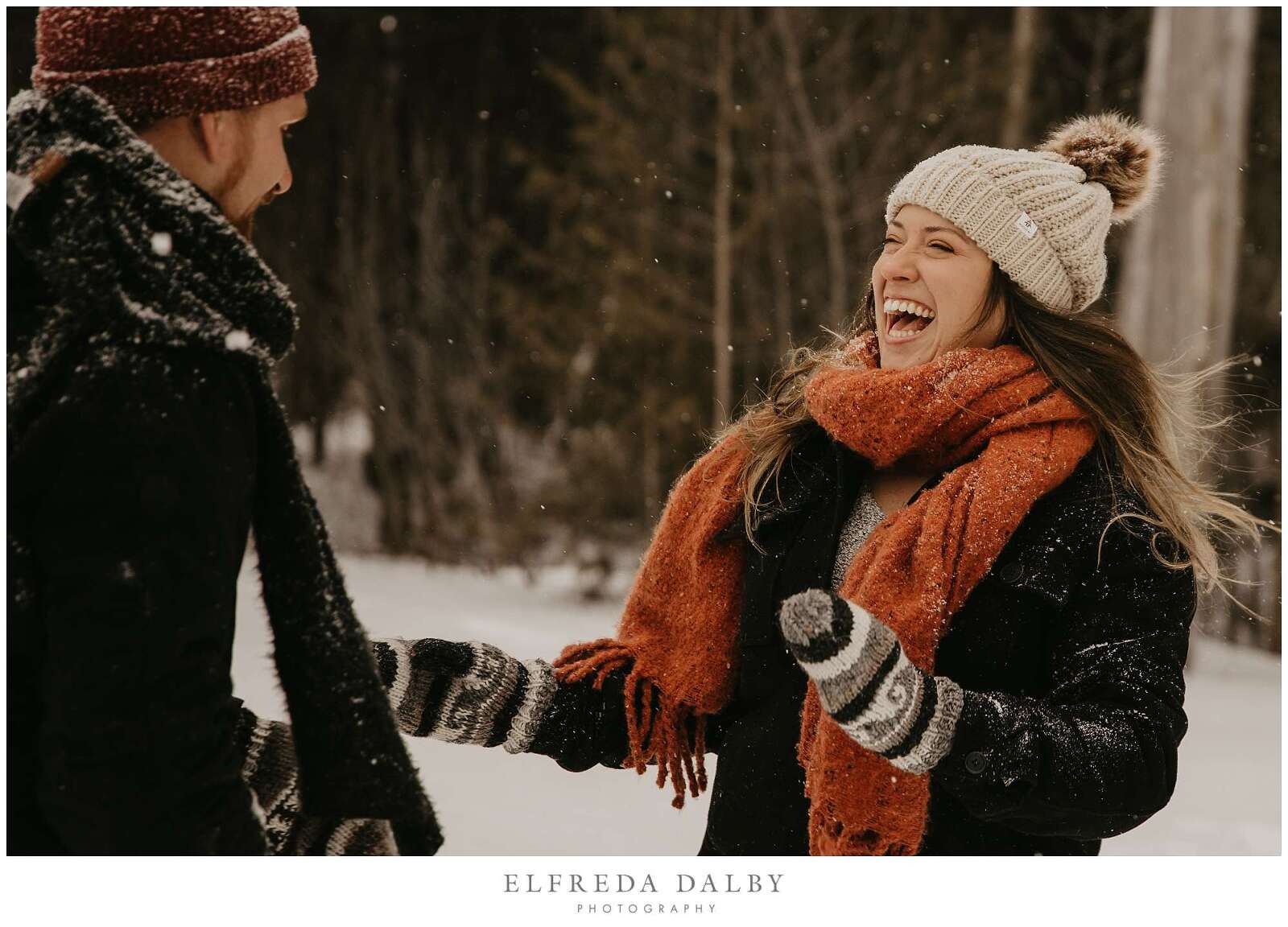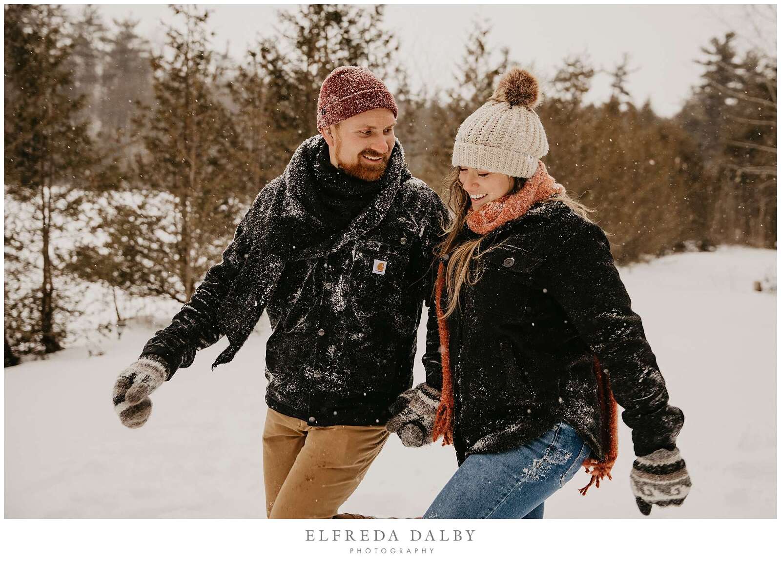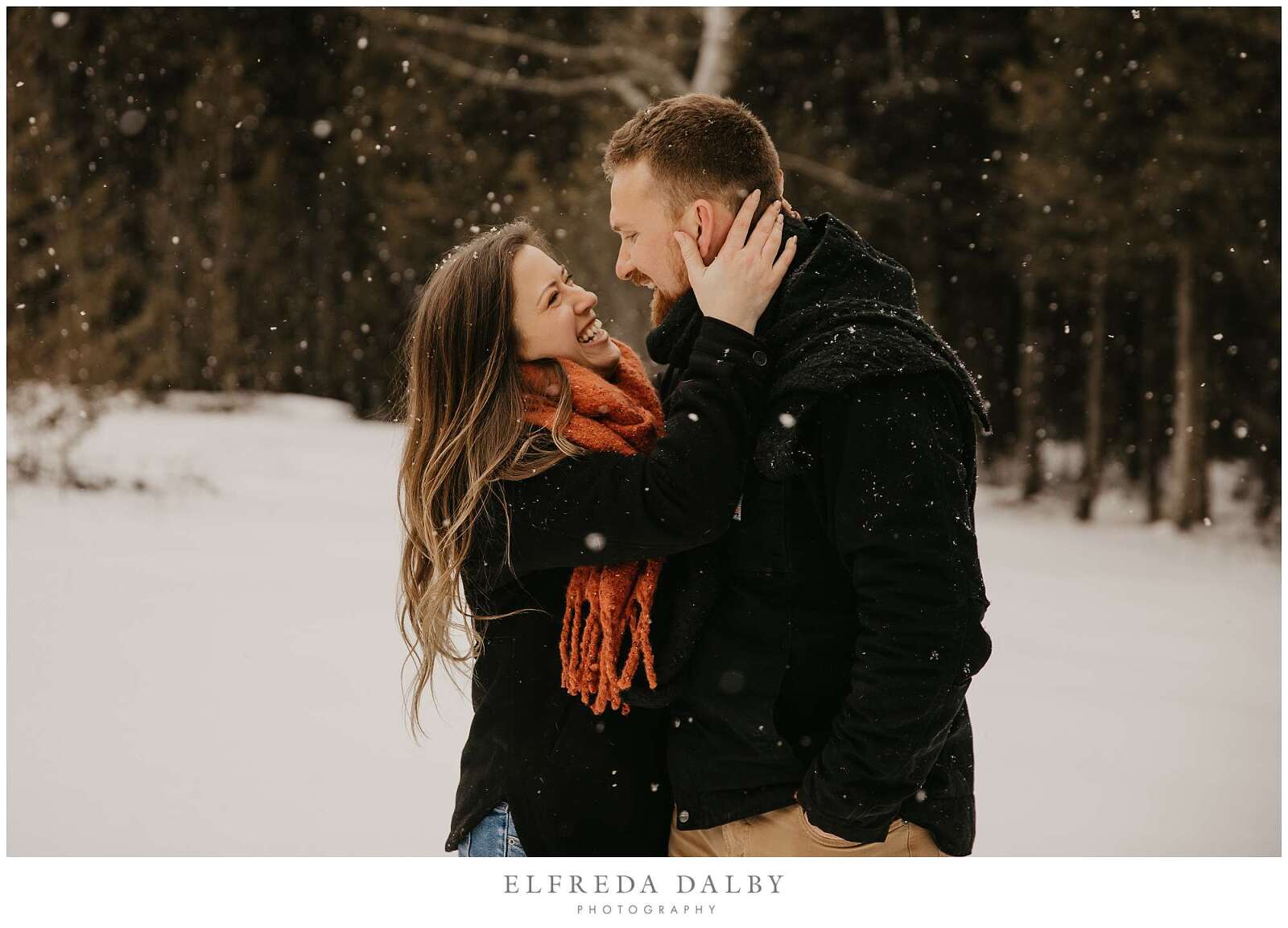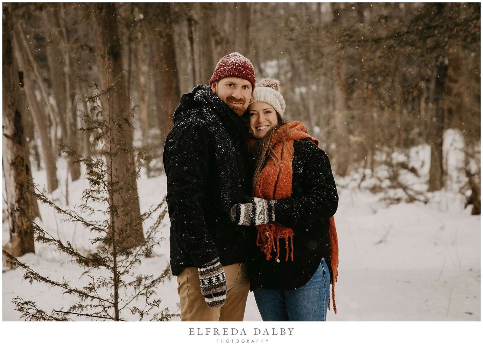As we started the shoot, flurries began to fall from the sky. It felt like the perfect moment for a romantic winter dream couple’s shoot. Rhian and Eric embraced the cold with joy. They played in the snow, letting their laughter fill the air. Their playfulness made it easy to capture real moments between this couple in love.