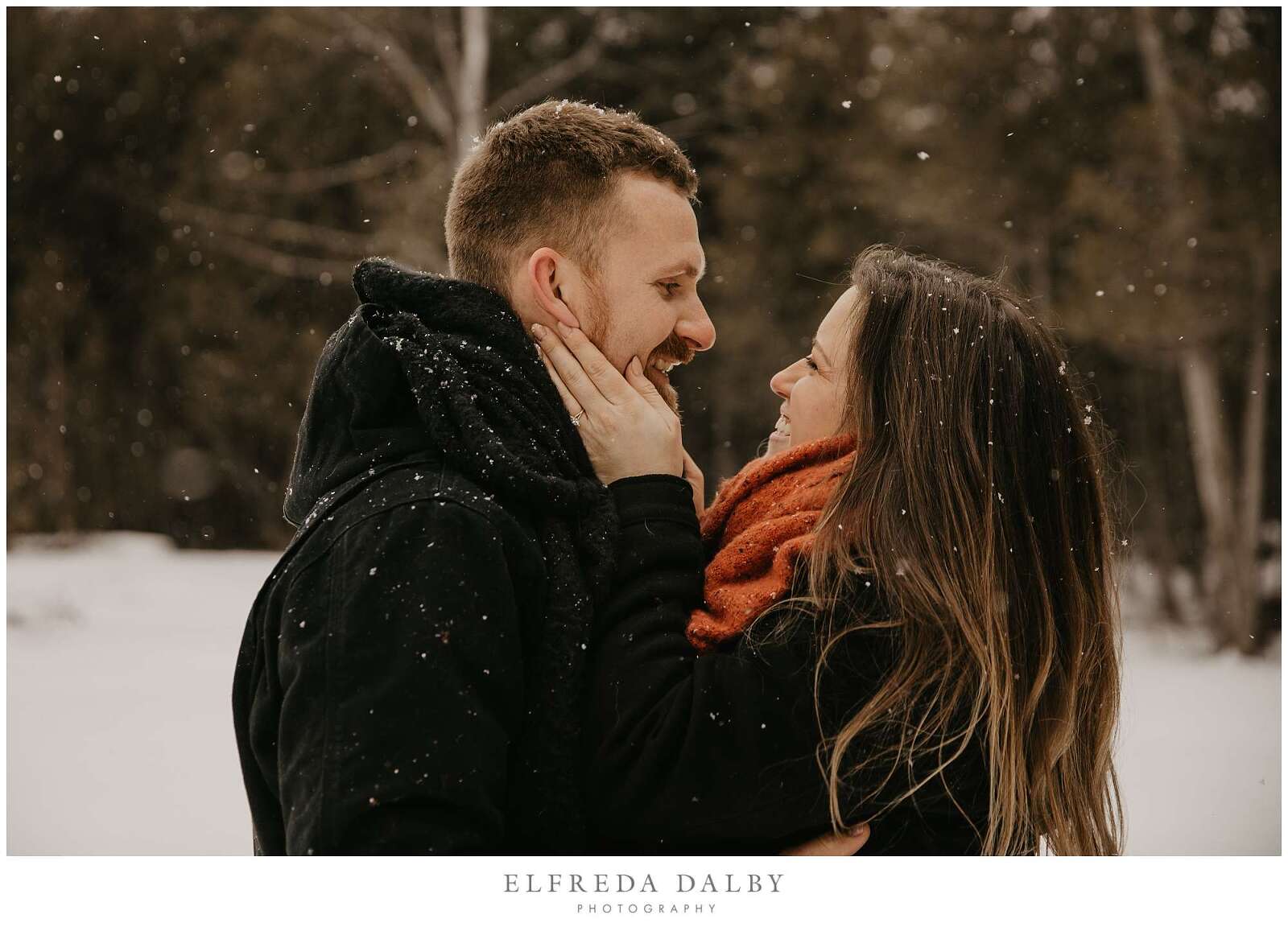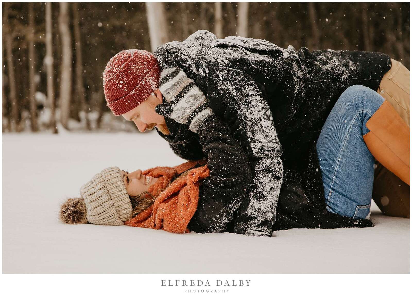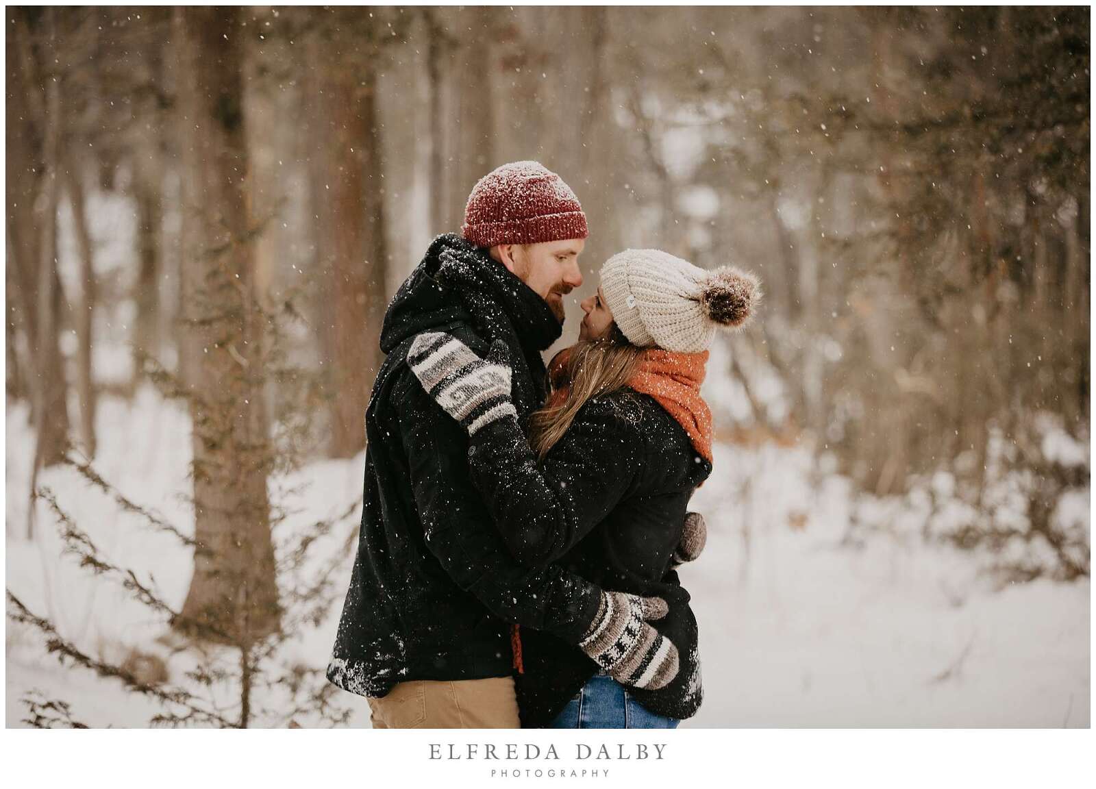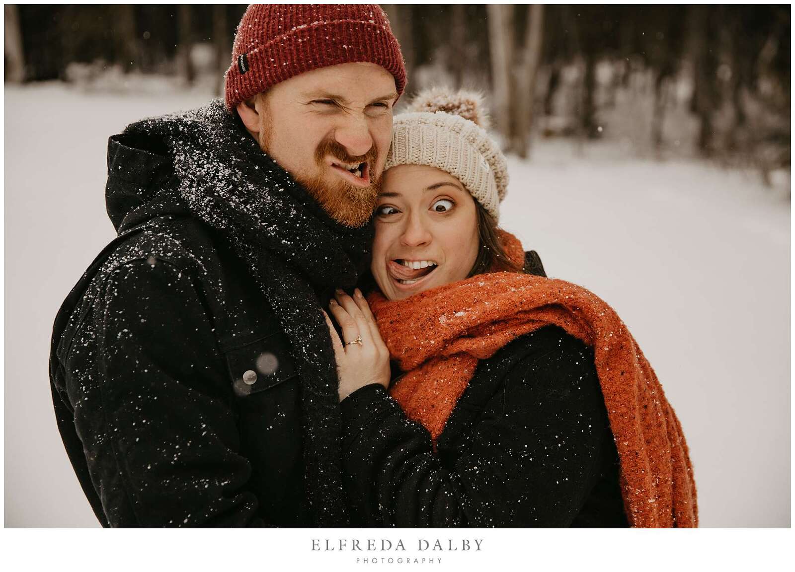 As we started the shoot, flurries began to fall from the sky. It felt like the perfect moment for a romantic winter dream couple’s shoot. Rhian and Eric embraced the cold with joy. They played in the snow, letting their laughter fill the air. Their playfulness made it easy to capture real moments between this couple in love.