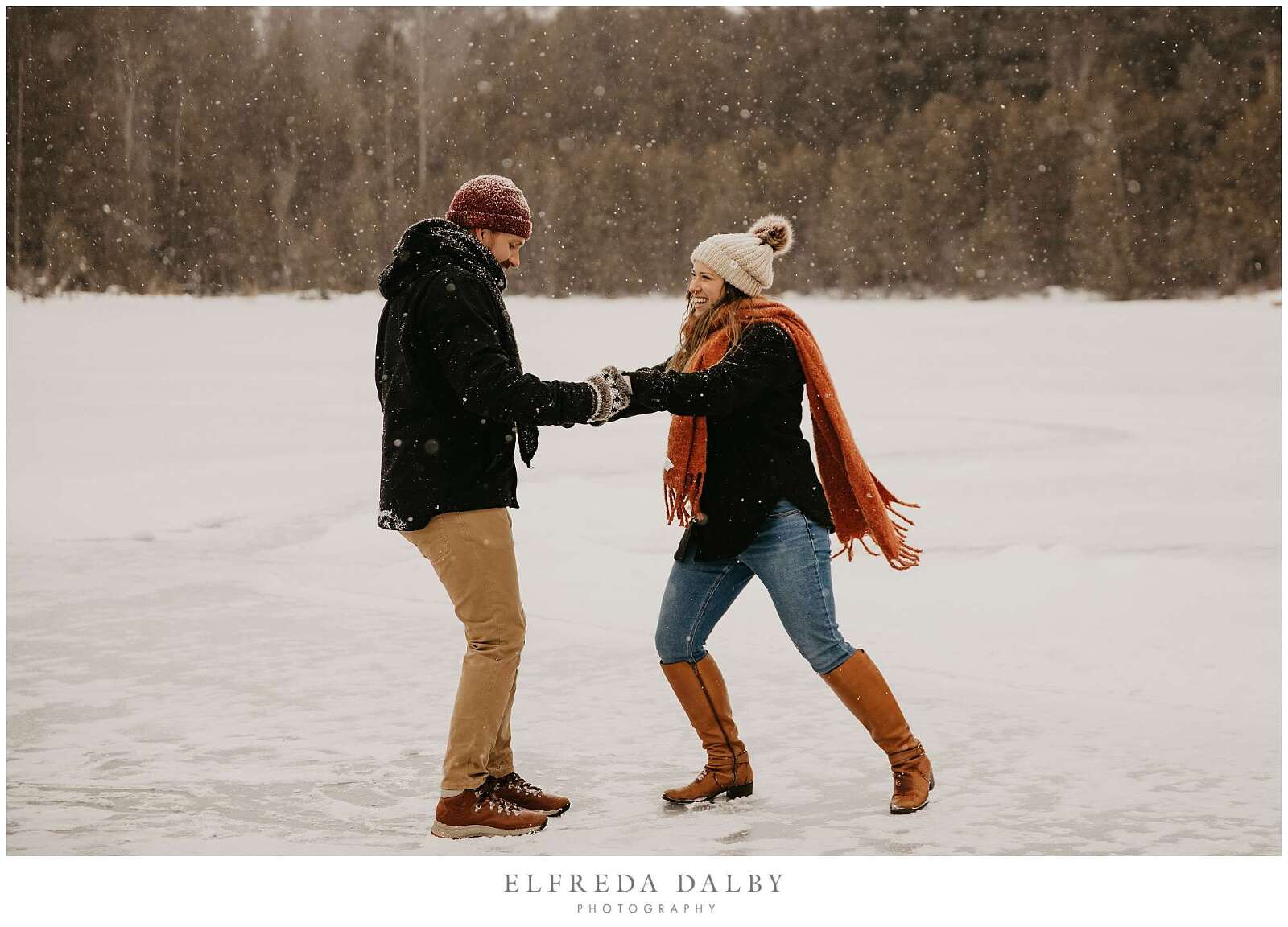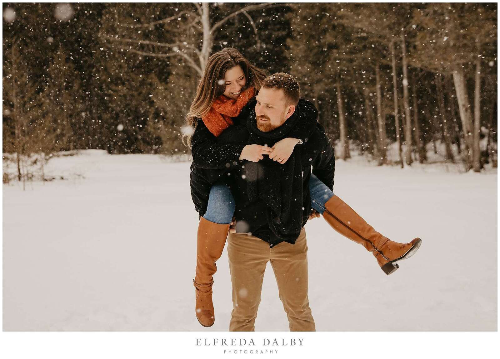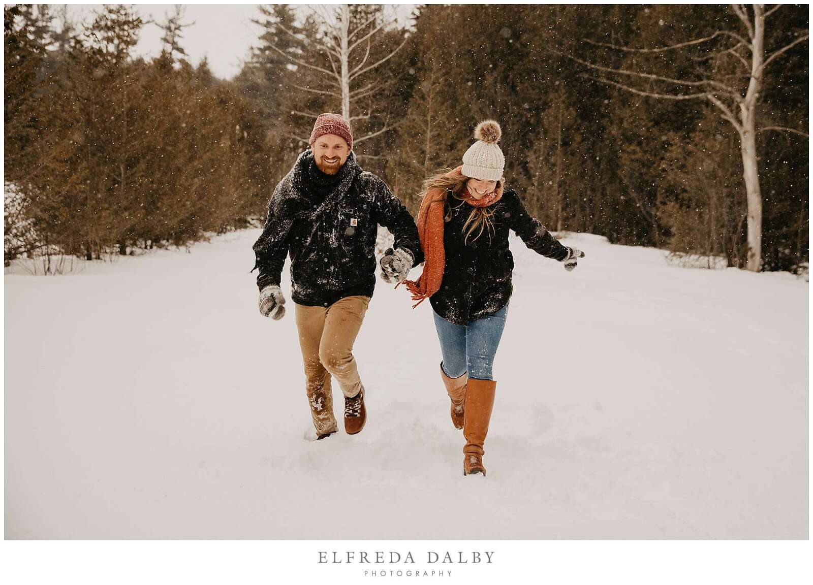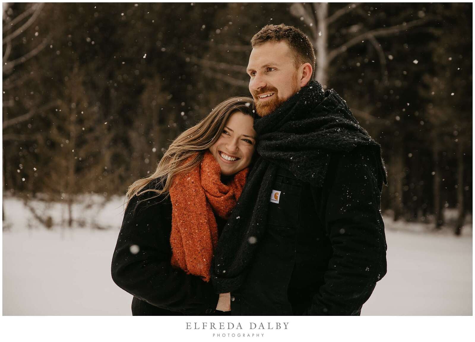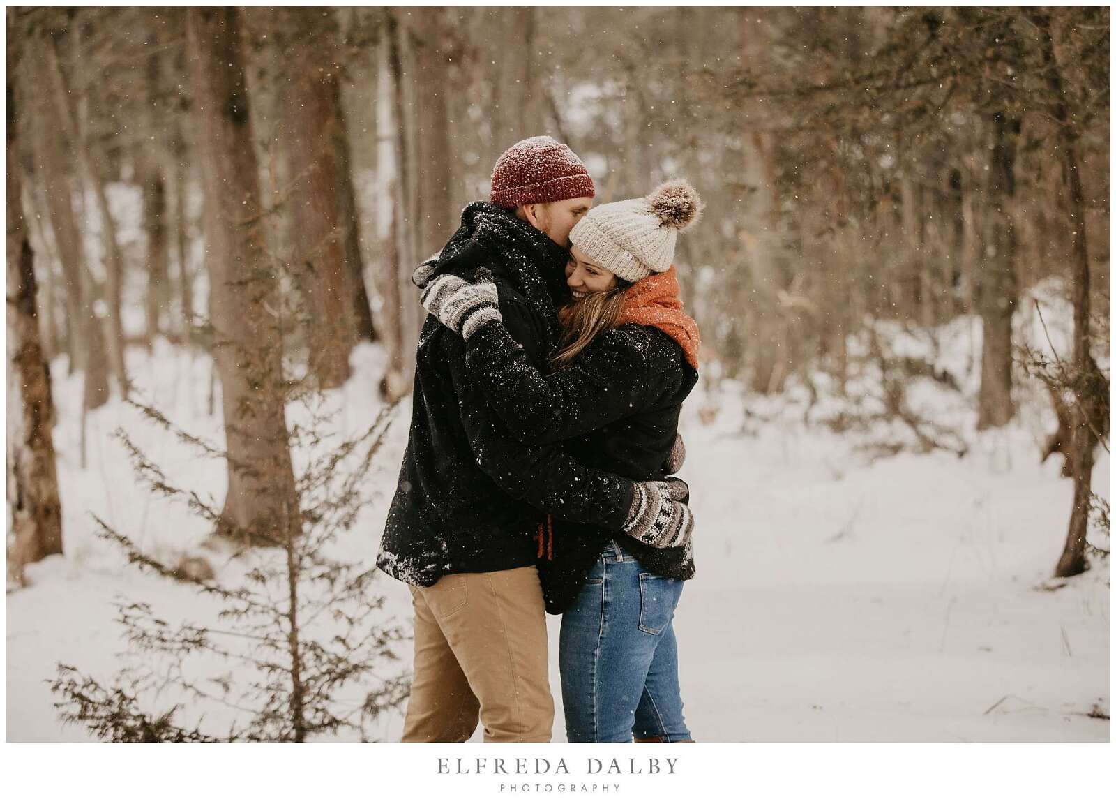 As we started the shoot, flurries began to fall from the sky. It felt like the perfect moment for a romantic winter dream couple’s shoot. Rhian and Eric embraced the cold with joy. They played in the snow, letting their laughter fill the air. Their playfulness made it easy to capture real moments between this couple in love.