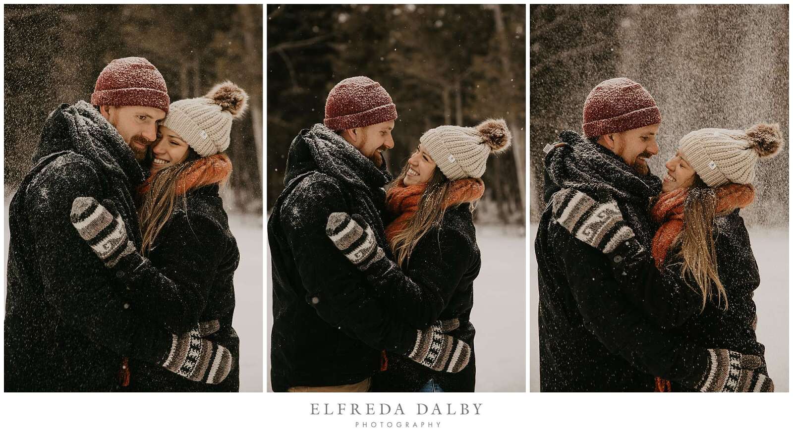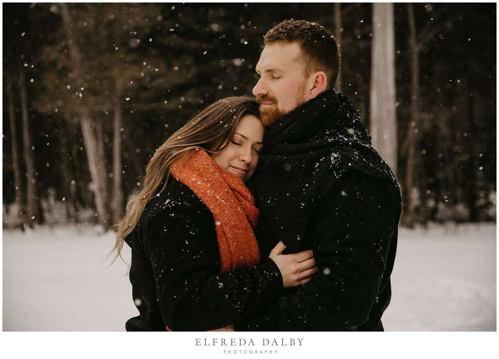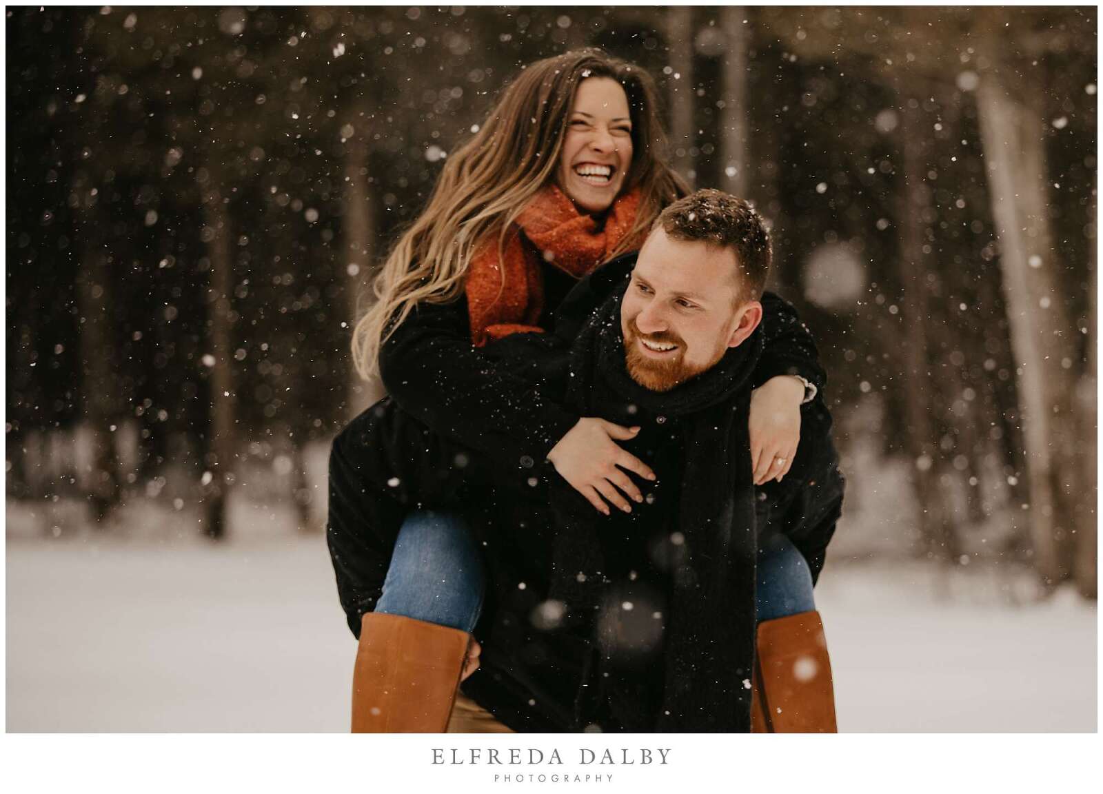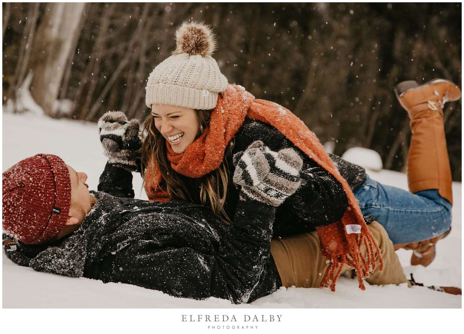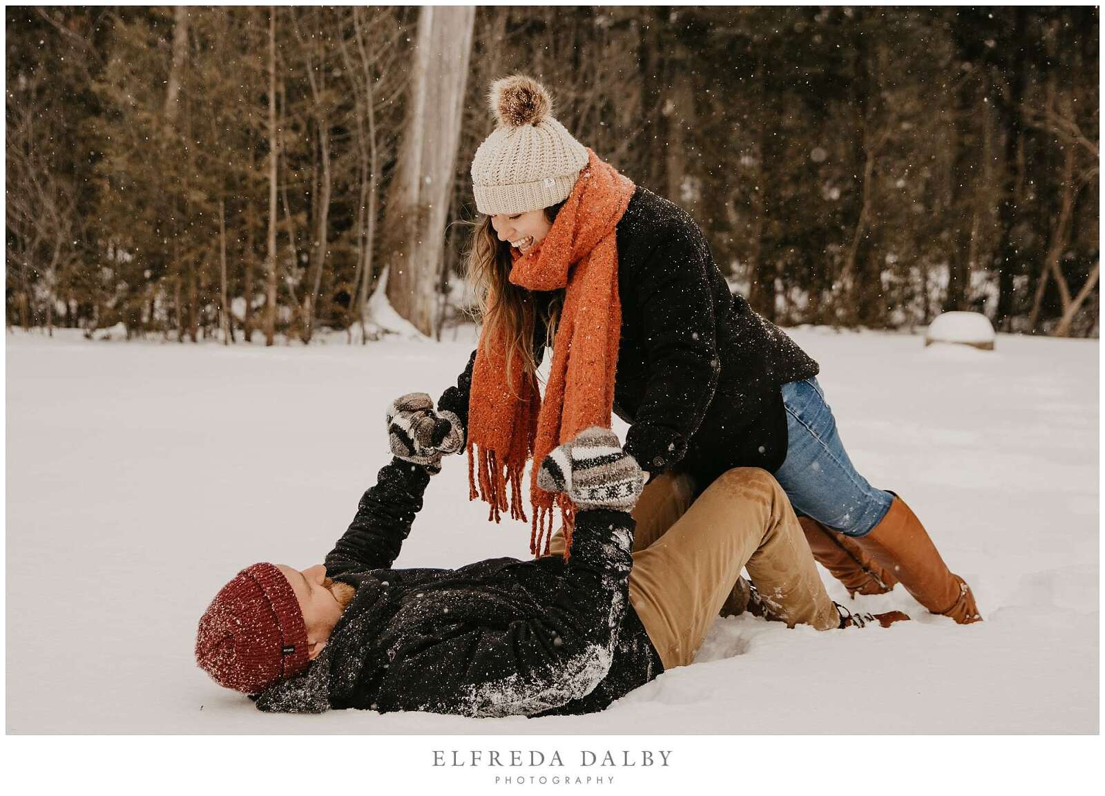 As we started the shoot, flurries began to fall from the sky. It felt like the perfect moment for a romantic winter dream couple’s shoot. Rhian and Eric embraced the cold with joy. They played in the snow, letting their laughter fill the air. Their playfulness made it easy to capture real moments between this couple in love.