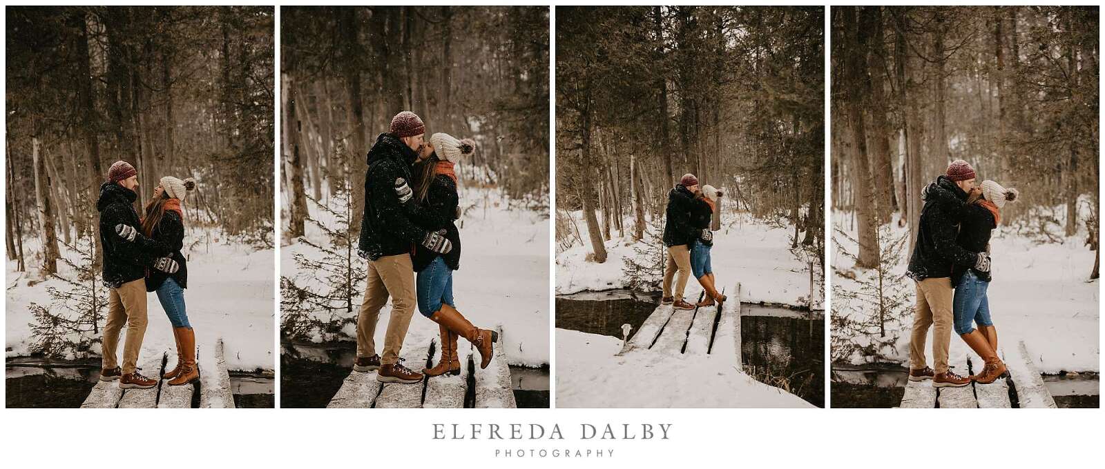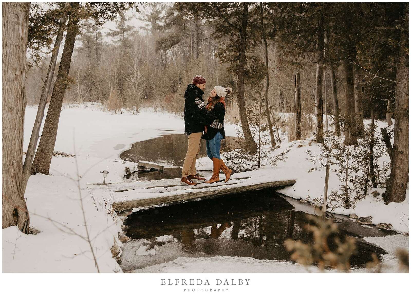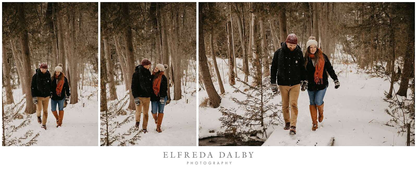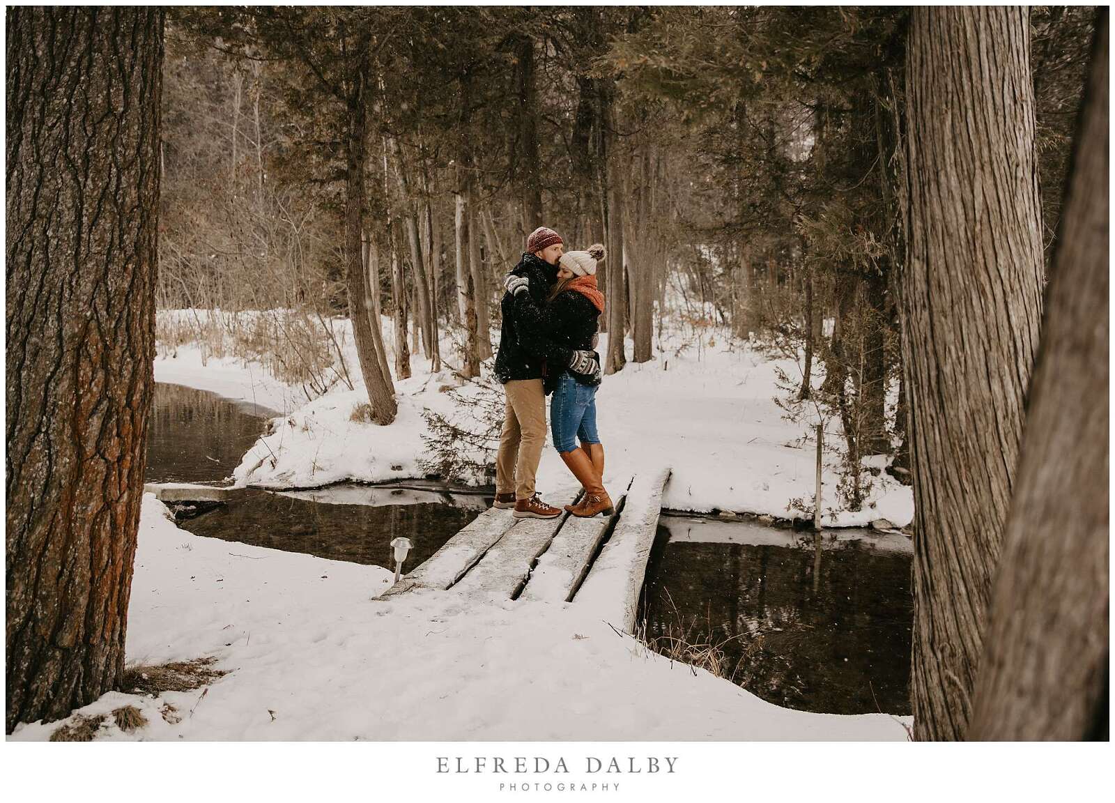 Winter can feel magical, especially when you are surrounded by snow. The snowy landscape on the rural property near Kitchener-Waterloo that Rhian and Eric chose for their winter engagement session was the perfect location. The woods looked like a winter wonderland. Deep piles of soft snow covered the ground, making everything looks white and bright.