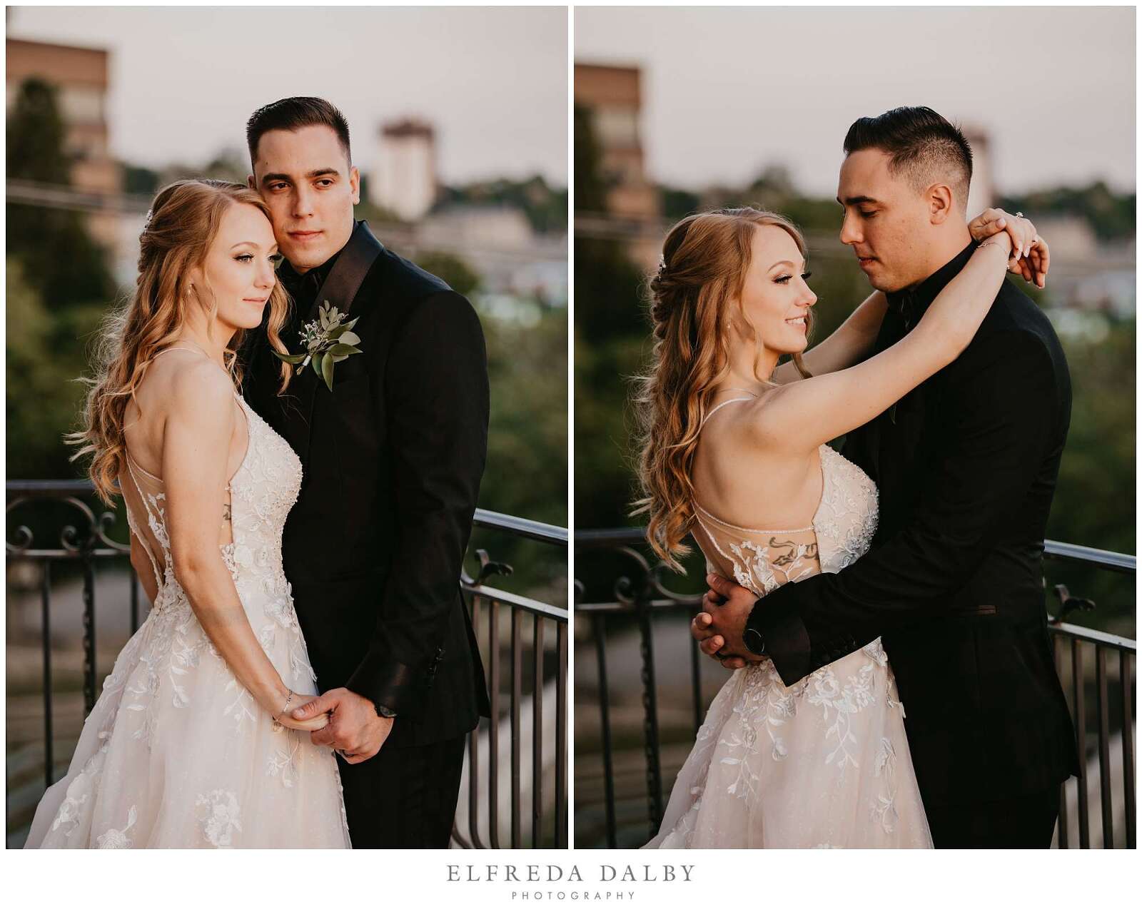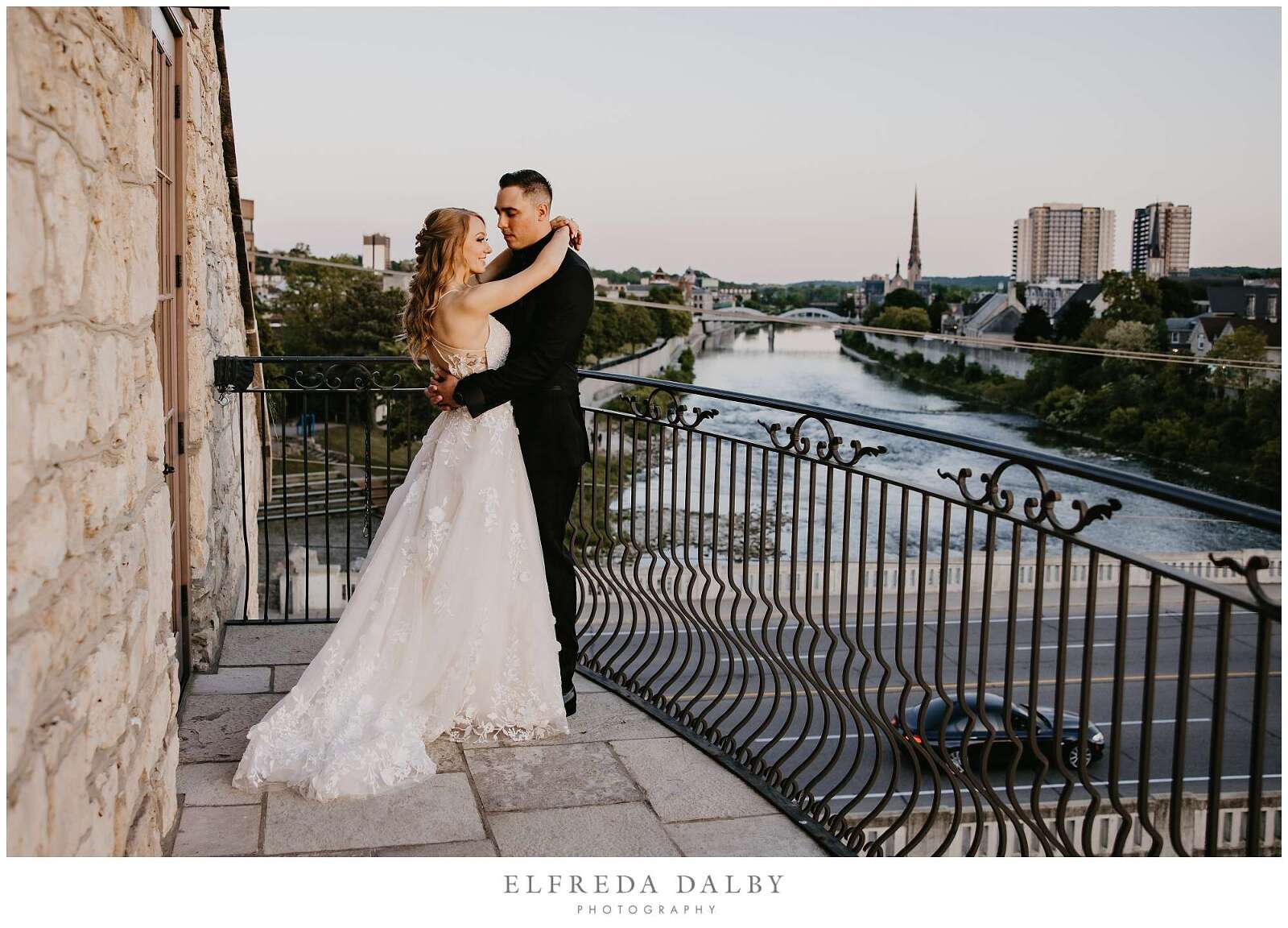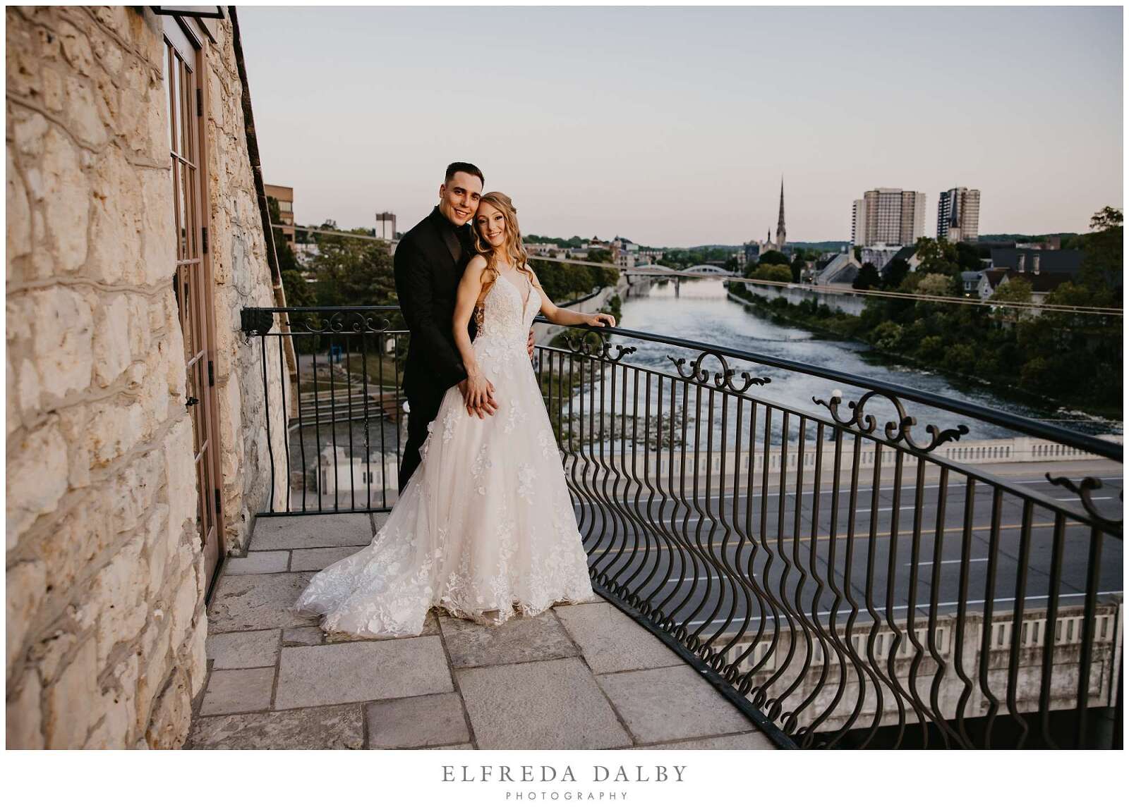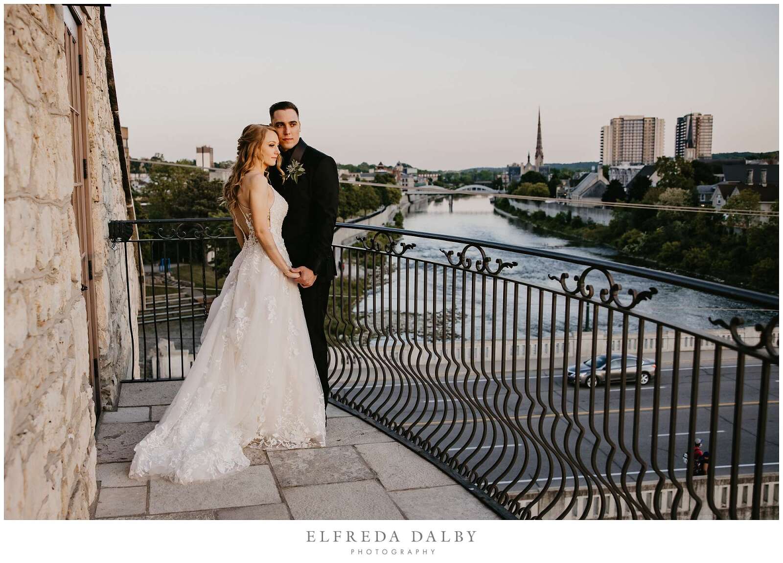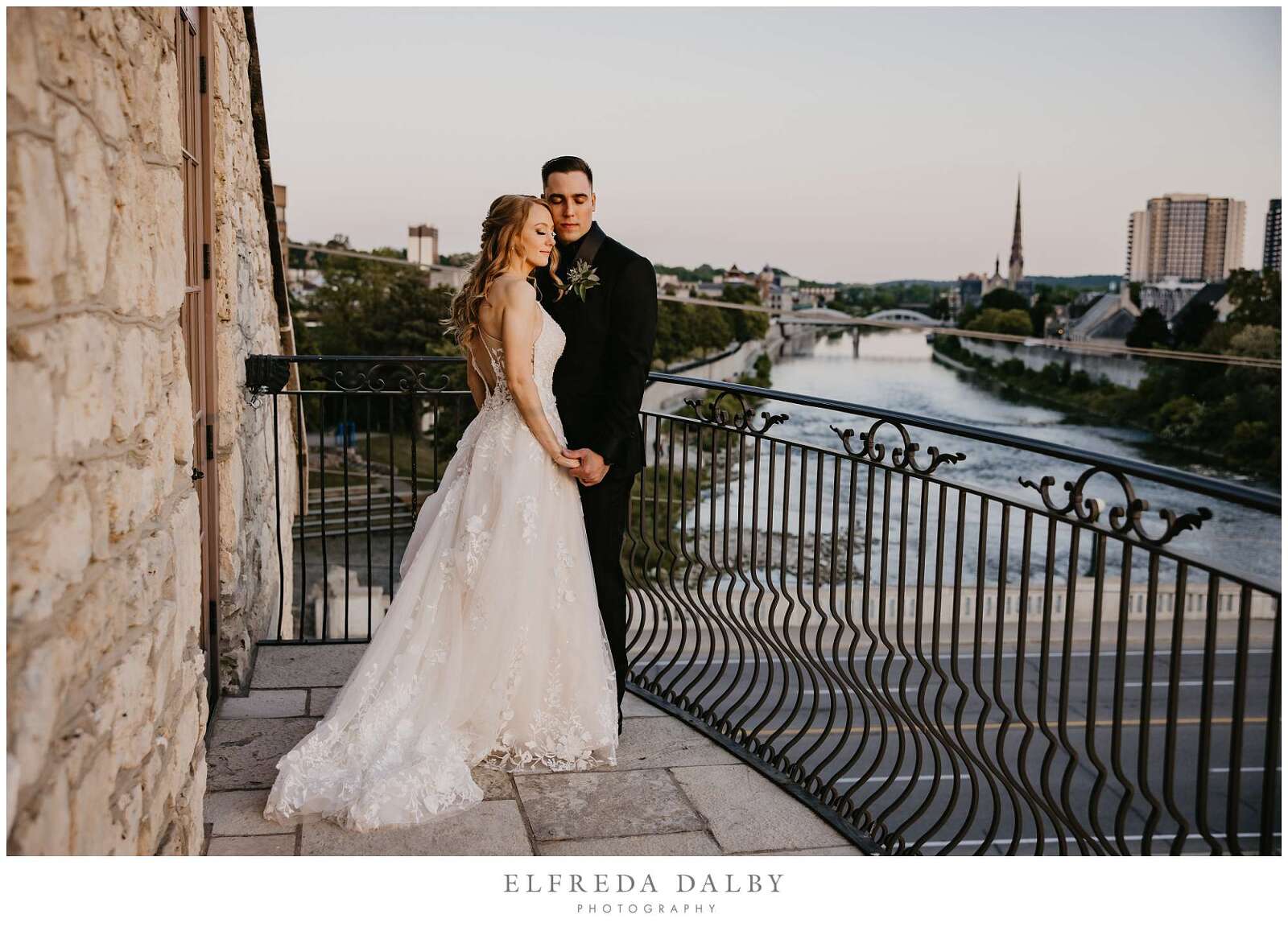 As the sun began to set, we took our lovely couple out for some golden hour photos around the Cambridge Mill property. We also made sure to get some portraits on the enchanting Juliet balcony. The view from up there is breathtaking and shouldn’t be missed.