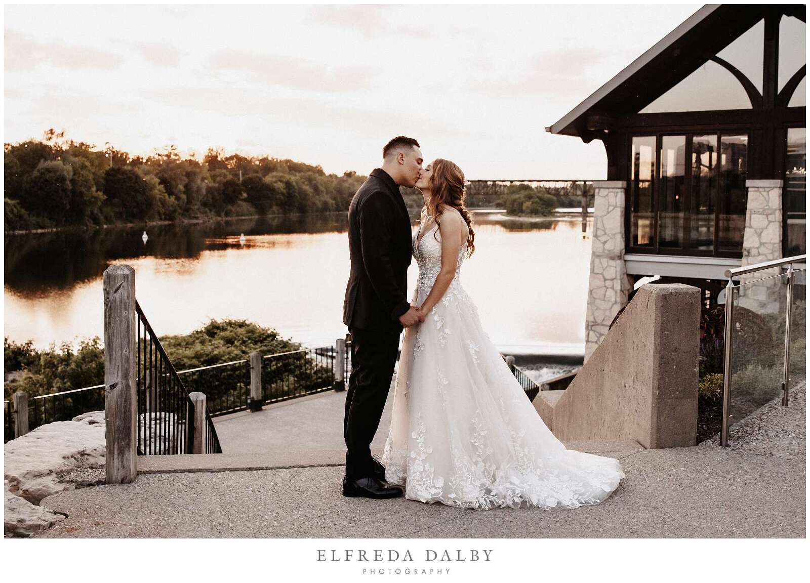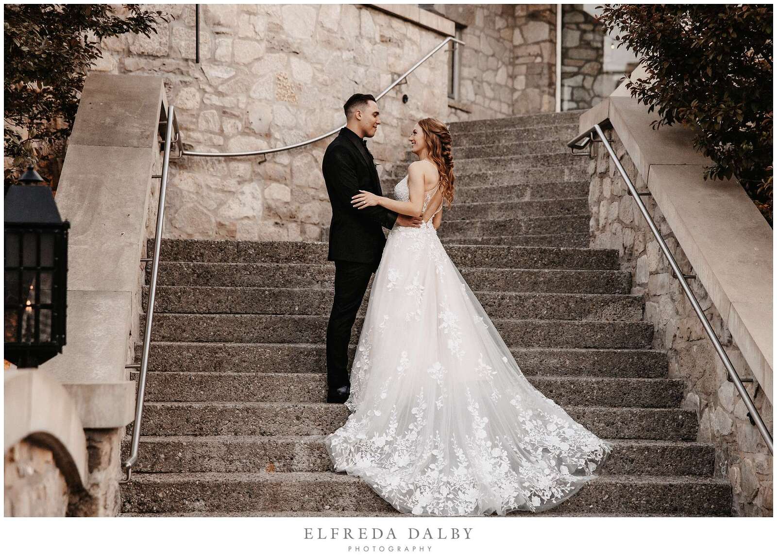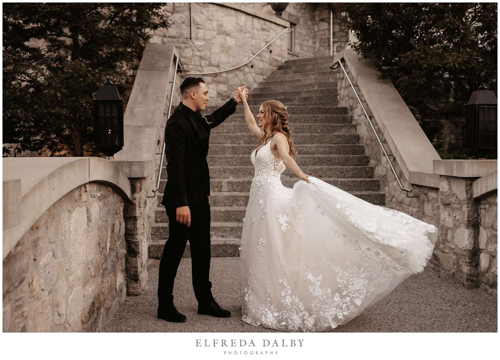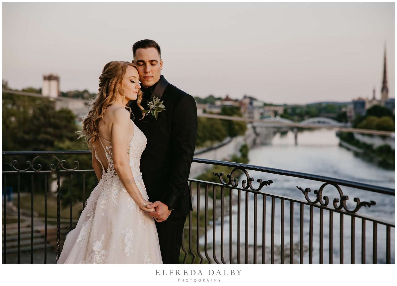 As the sun began to set, we took our lovely couple out for some golden hour photos around the Cambridge Mill property. We also made sure to get some portraits on the enchanting Juliet balcony. The view from up there is breathtaking and shouldn’t be missed.