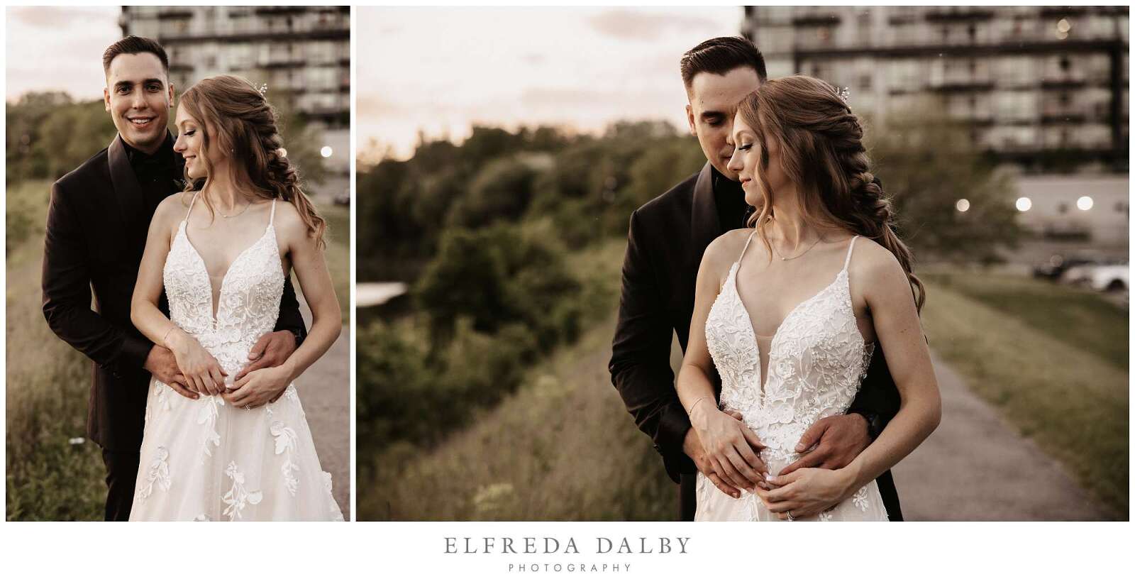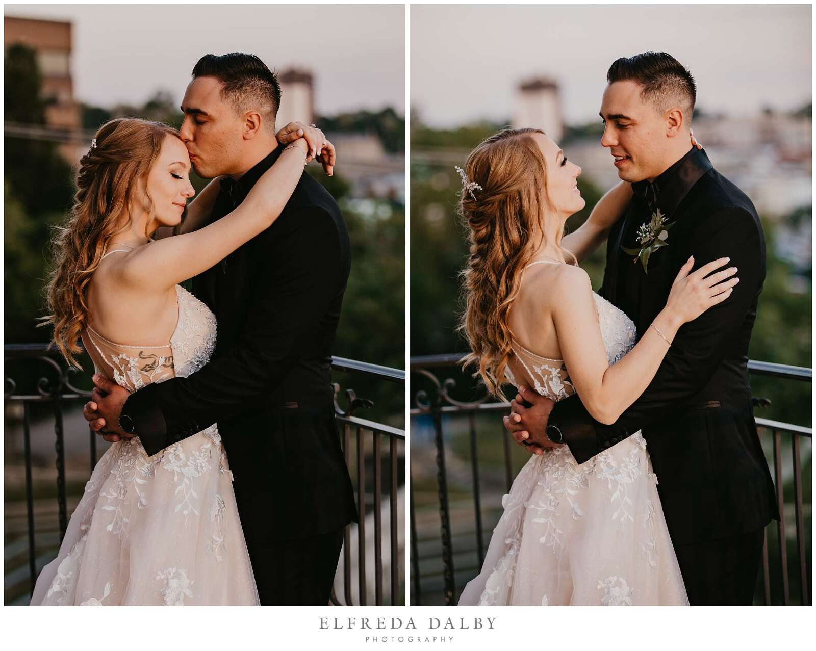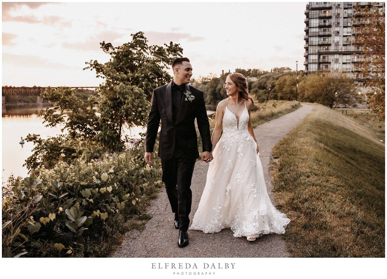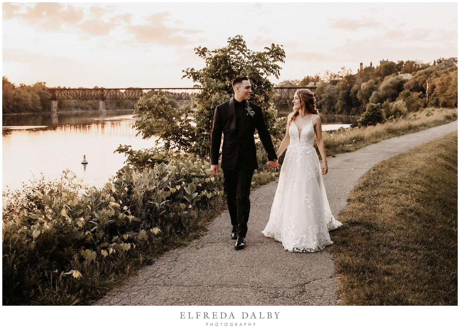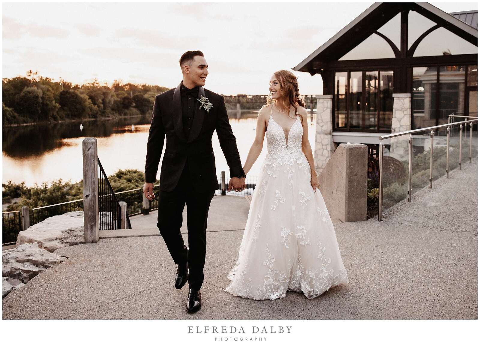 As the sun began to set, we took our lovely couple out for some golden hour photos around the Cambridge Mill property. We also made sure to get some portraits on the enchanting Juliet balcony. The view from up there is breathtaking and shouldn’t be missed.