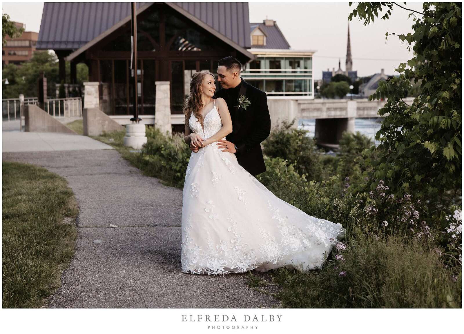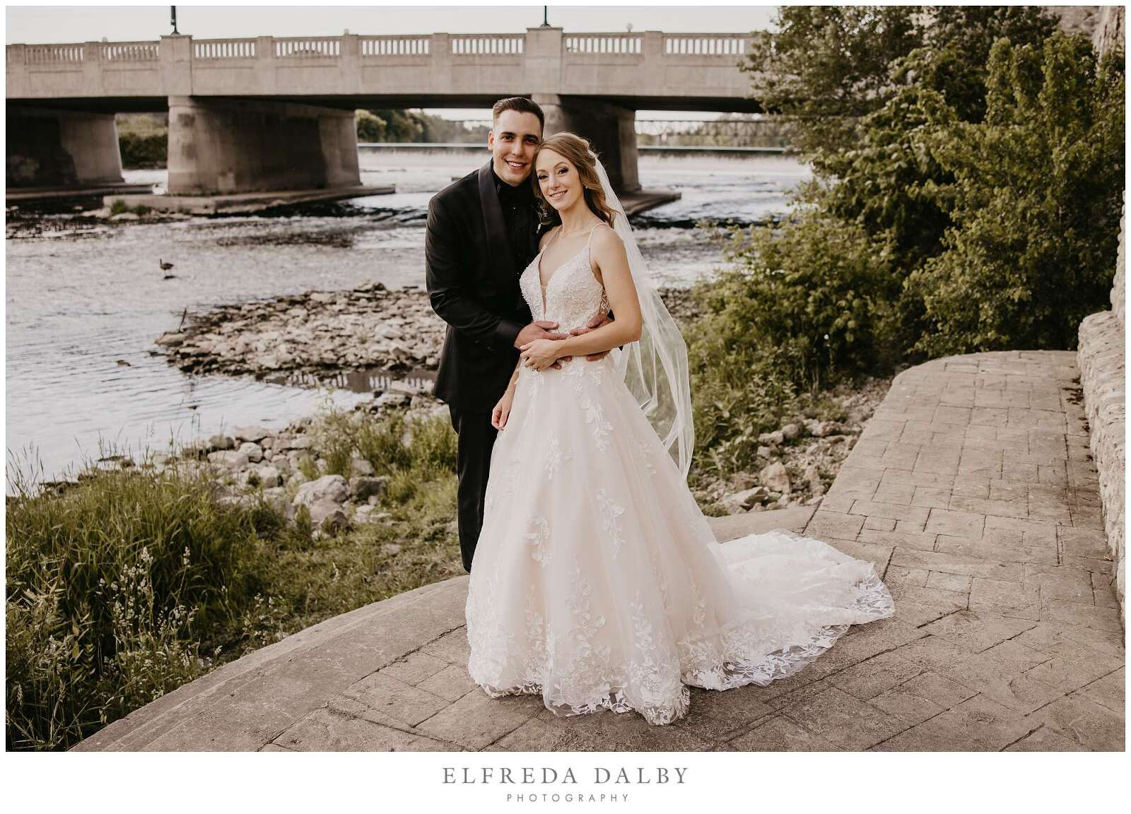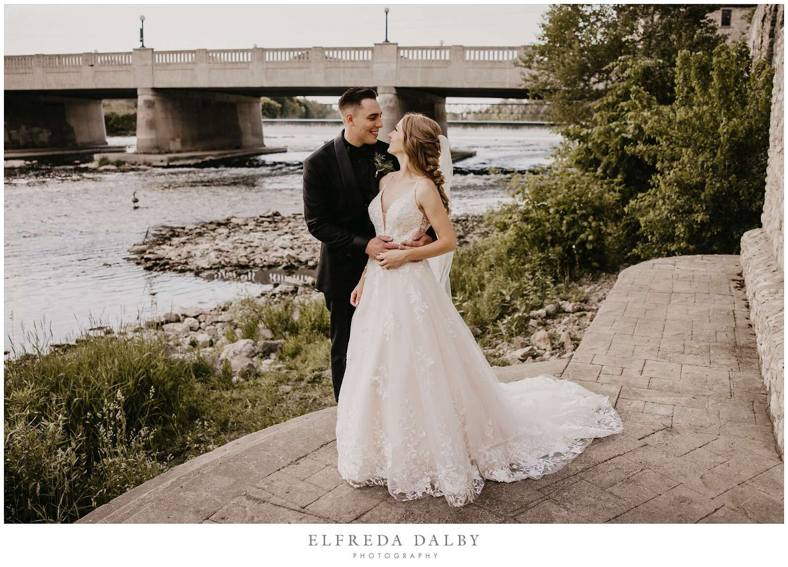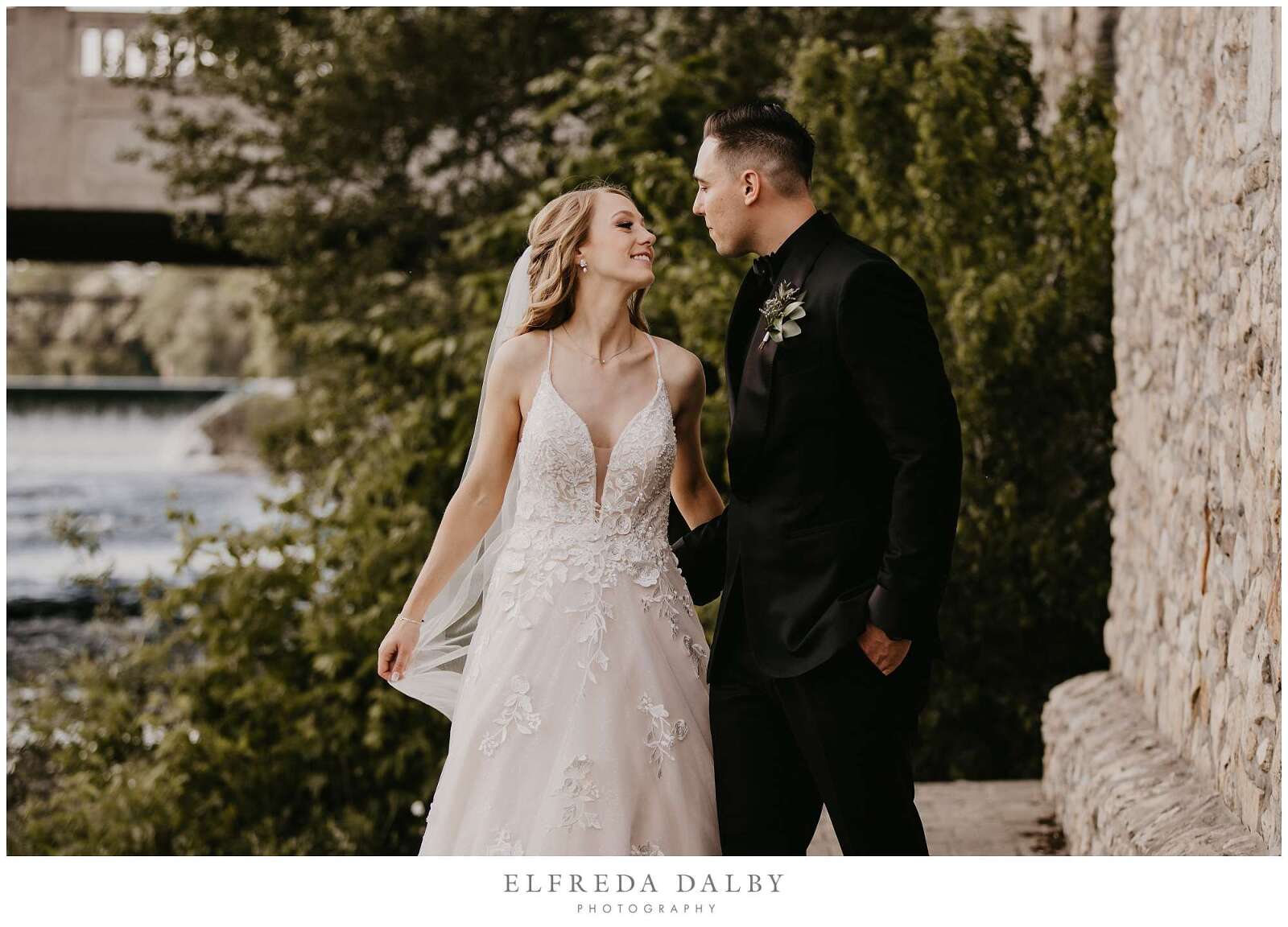 Before the ceremony, Sarah and Albert shared a first look and some quiet moments together. This allowed them to connect before their ceremony and they felt much more relaxed after they had some time together. It also gave them more time for their couple portraits which we took advantage of by getting some gorgeous portraits in the Mill Race Park Amphitheatre. Its cobblestone path and stone ruins by the river made for gorgeous portraits. We also made sure to go right down to the river’s edge for some bride and groom portraits, too.
