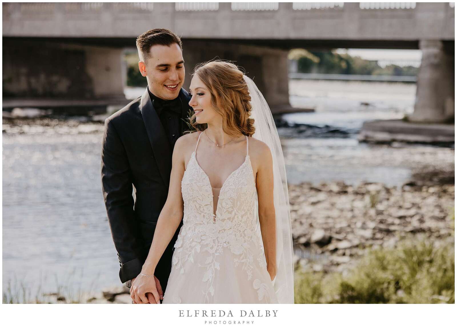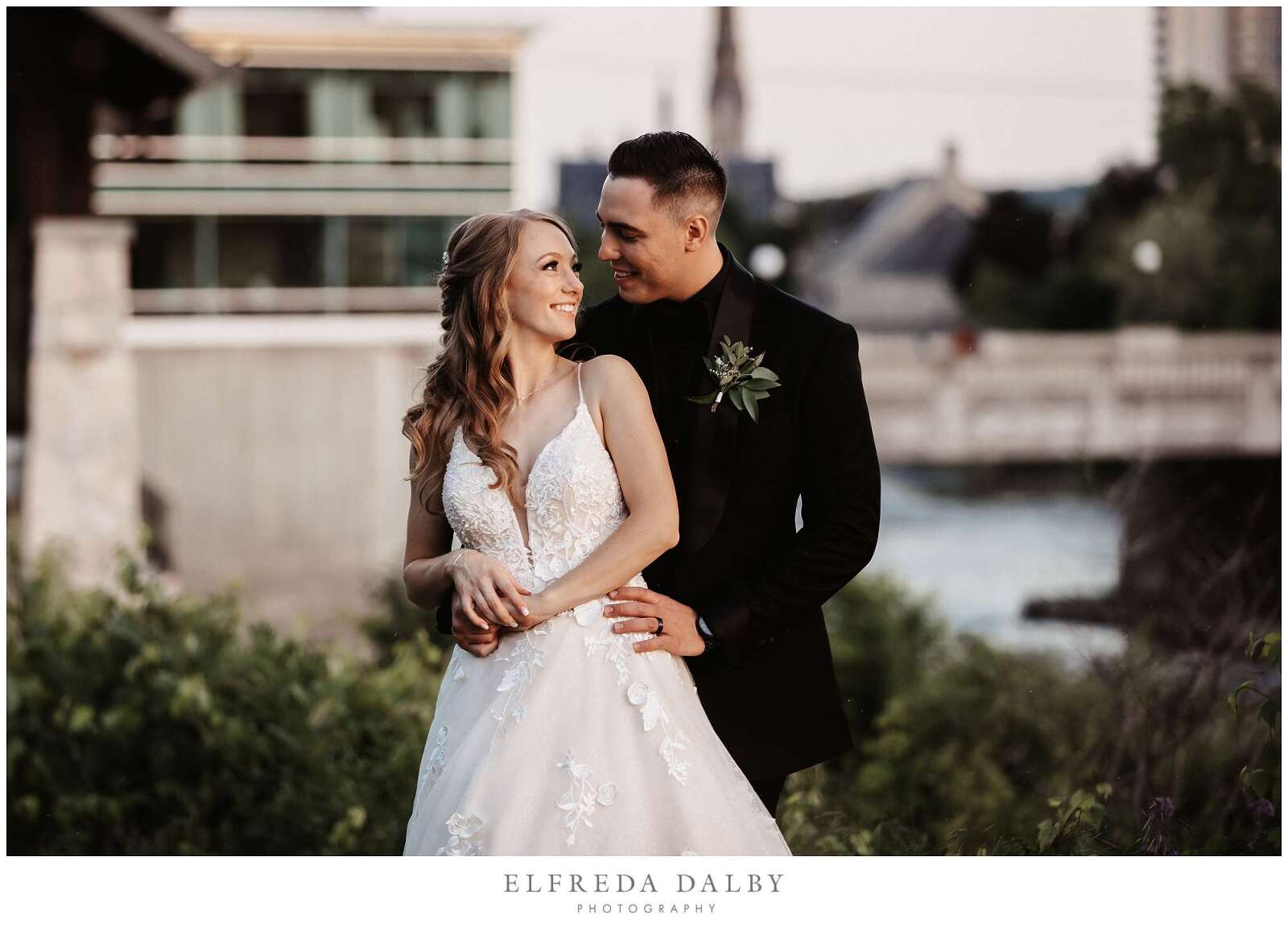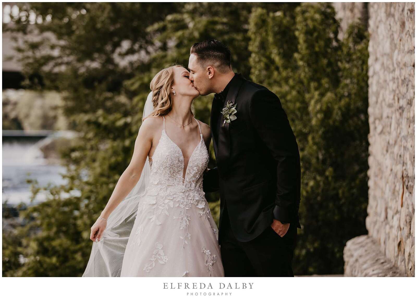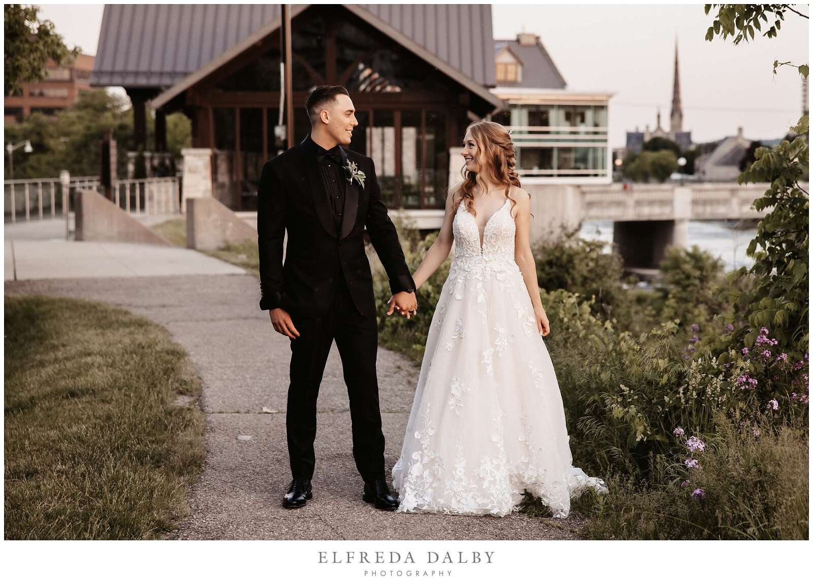 Before the ceremony, Sarah and Albert shared a first look and some quiet moments together. This allowed them to connect before their ceremony and they felt much more relaxed after they had some time together. It also gave them more time for their couple portraits which we took advantage of by getting some gorgeous portraits in the Mill Race Park Amphitheatre. Its cobblestone path and stone ruins by the river made for gorgeous portraits. We also made sure to go right down to the river’s edge for some bride and groom portraits, too.