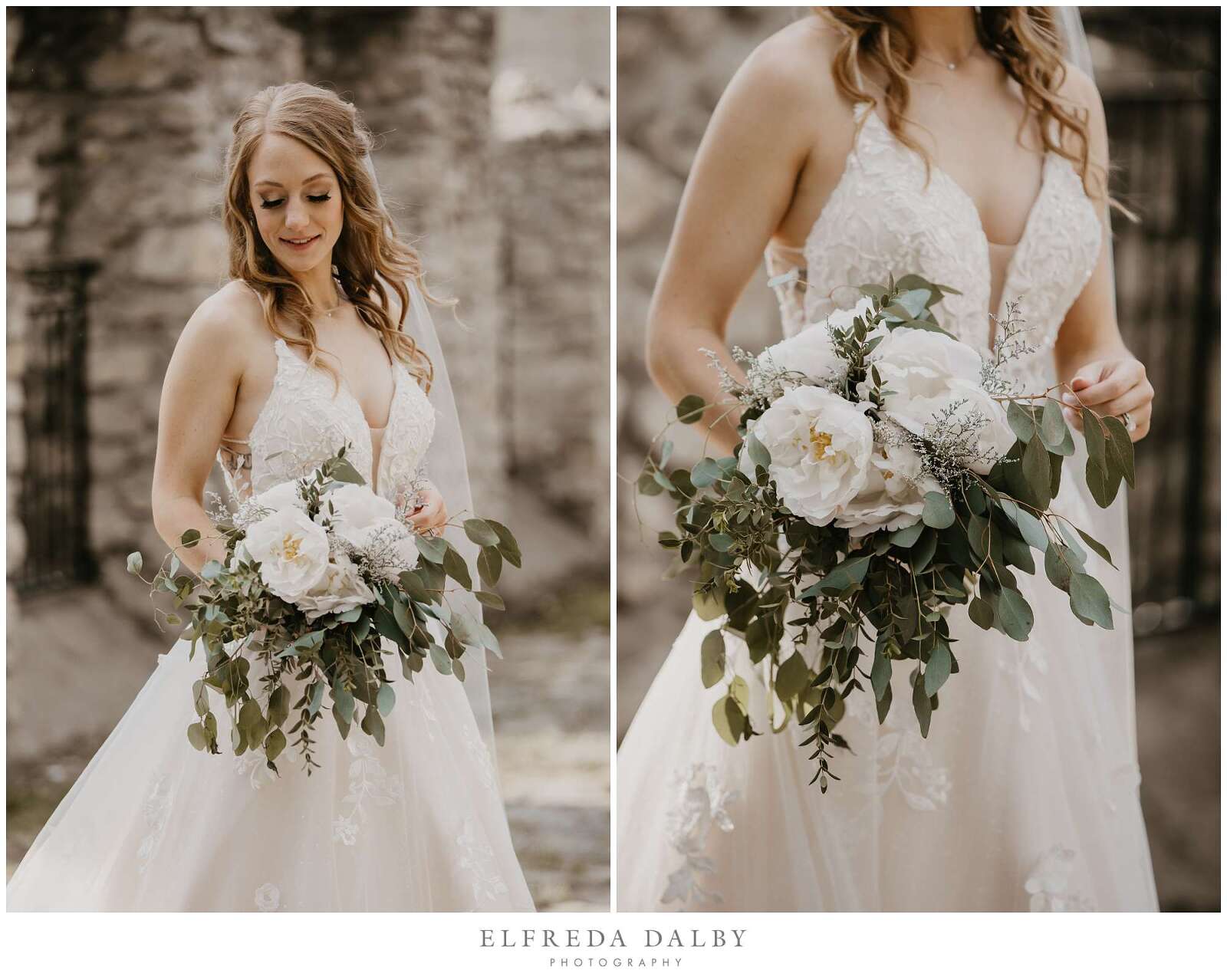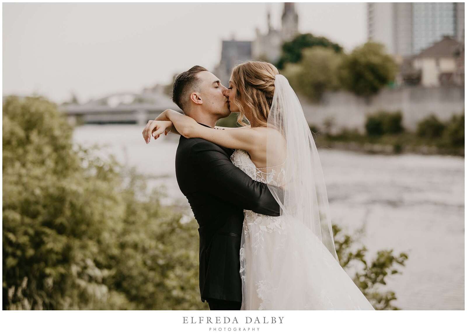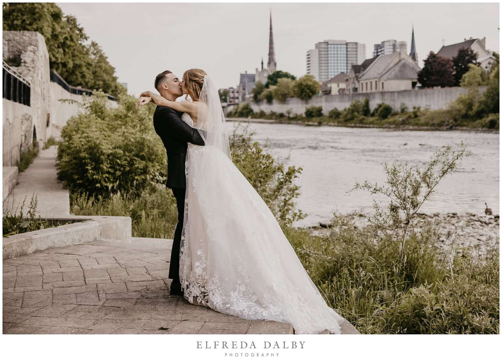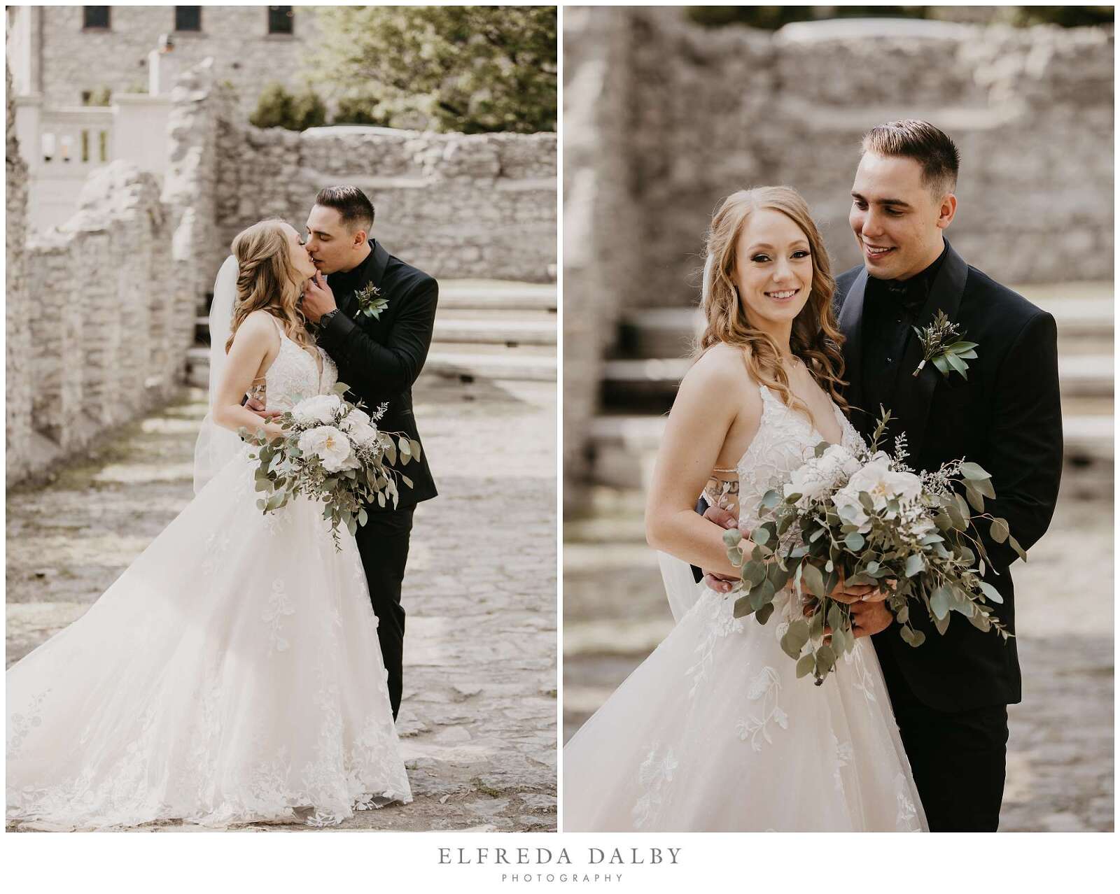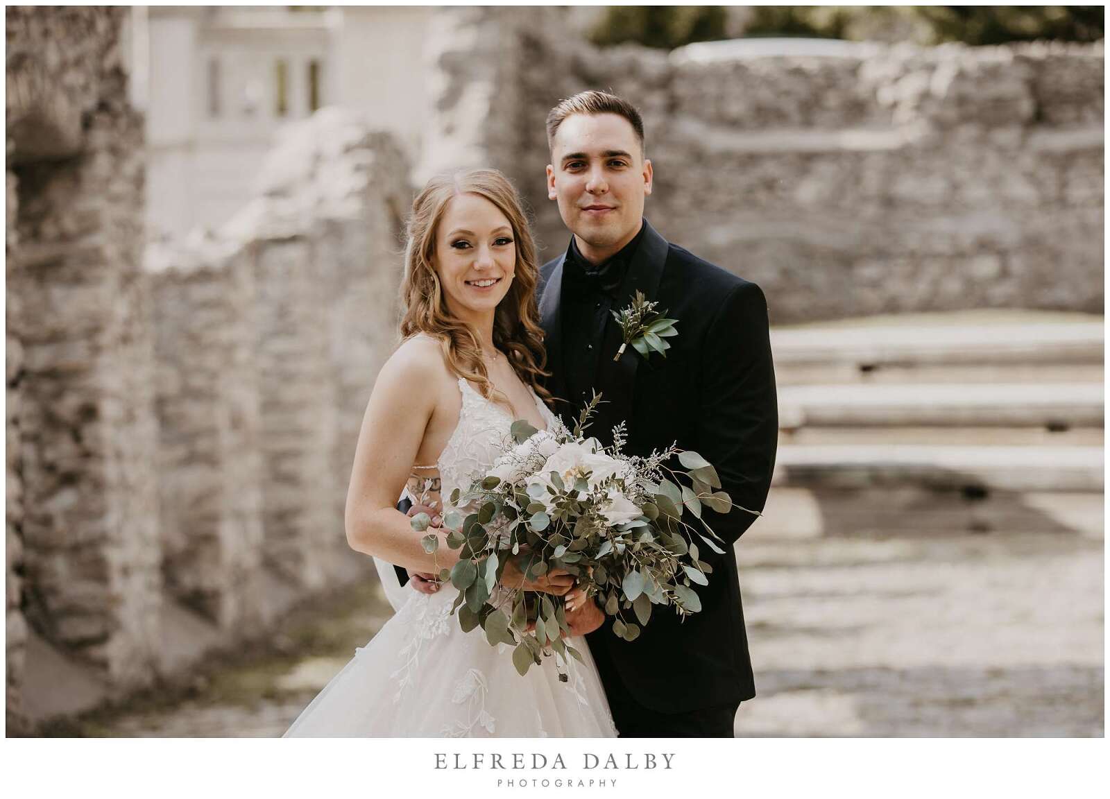 Before the ceremony, Sarah and Albert shared a first look and some quiet moments together. This allowed them to connect before their ceremony and they felt much more relaxed after they had some time together. It also gave them more time for their couple portraits which we took advantage of by getting some gorgeous portraits in the Mill Race Park Amphitheatre. Its cobblestone path and stone ruins by the river made for gorgeous portraits. We also made sure to go right down to the river’s edge for some bride and groom portraits, too.