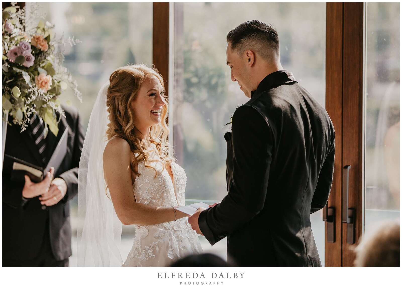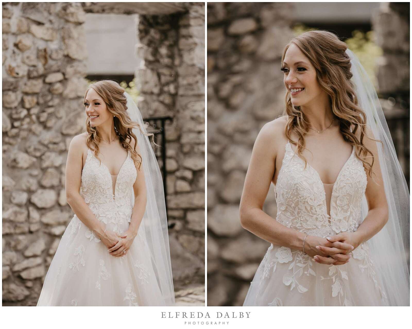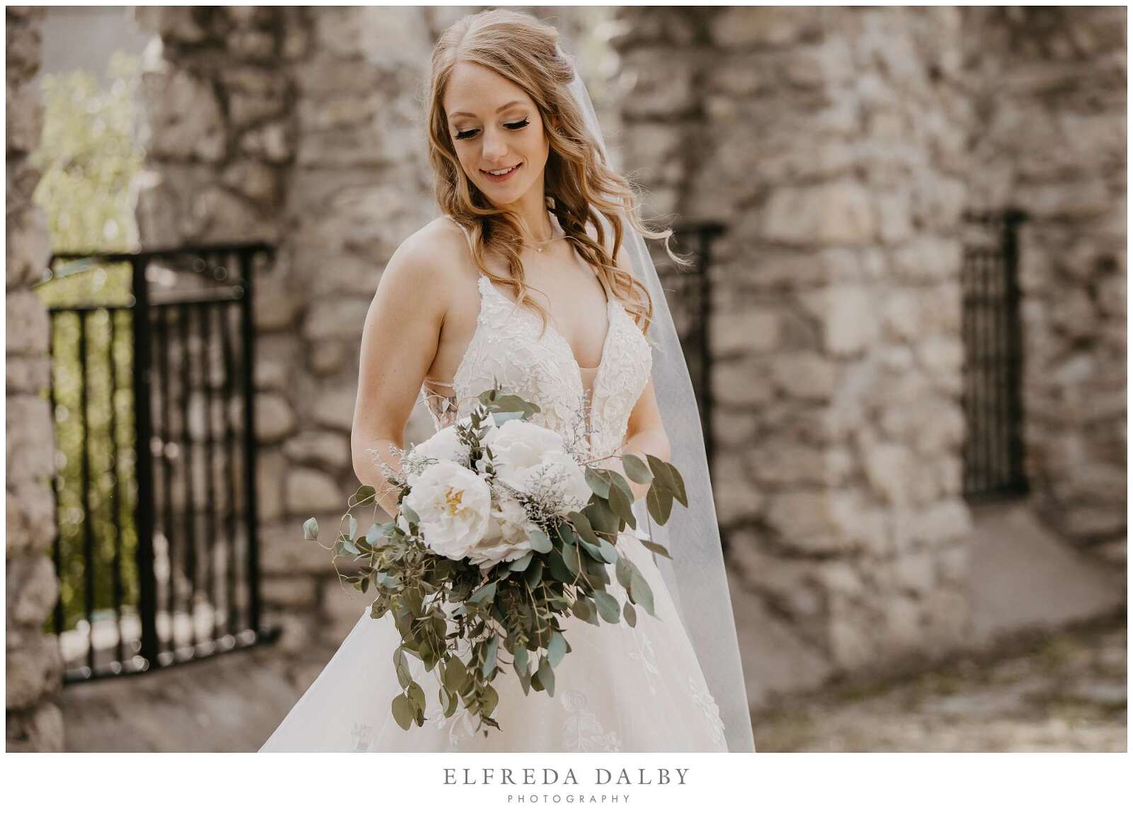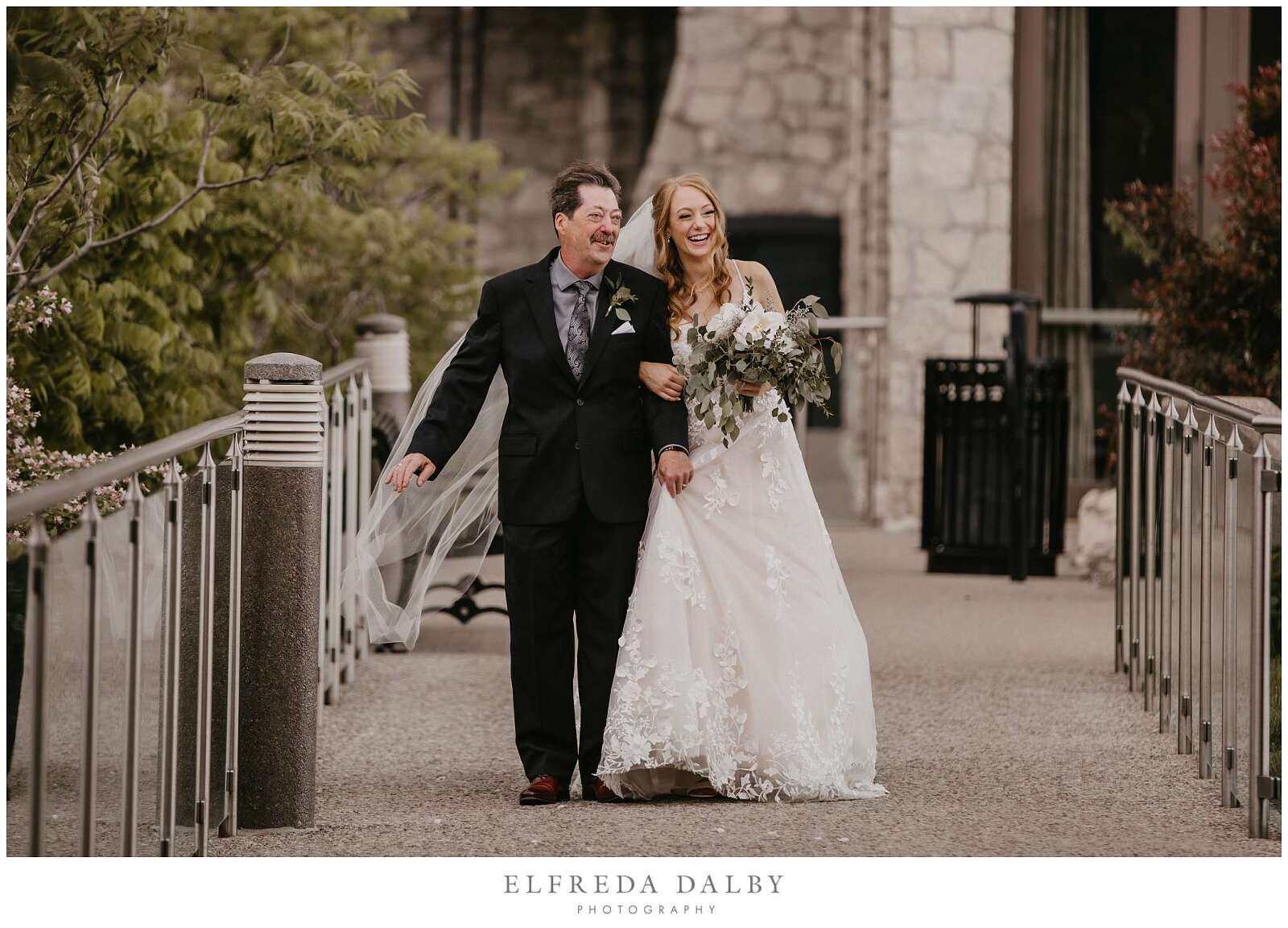 Before the ceremony, Sarah and Albert shared a first look and some quiet moments together. This allowed them to connect before their ceremony and they felt much more relaxed after they had some time together. It also gave them more time for their couple portraits which we took advantage of by getting some gorgeous portraits in the Mill Race Park Amphitheatre. Its cobblestone path and stone ruins by the river made for gorgeous portraits. We also made sure to go right down to the river’s edge for some bride and groom portraits, too.