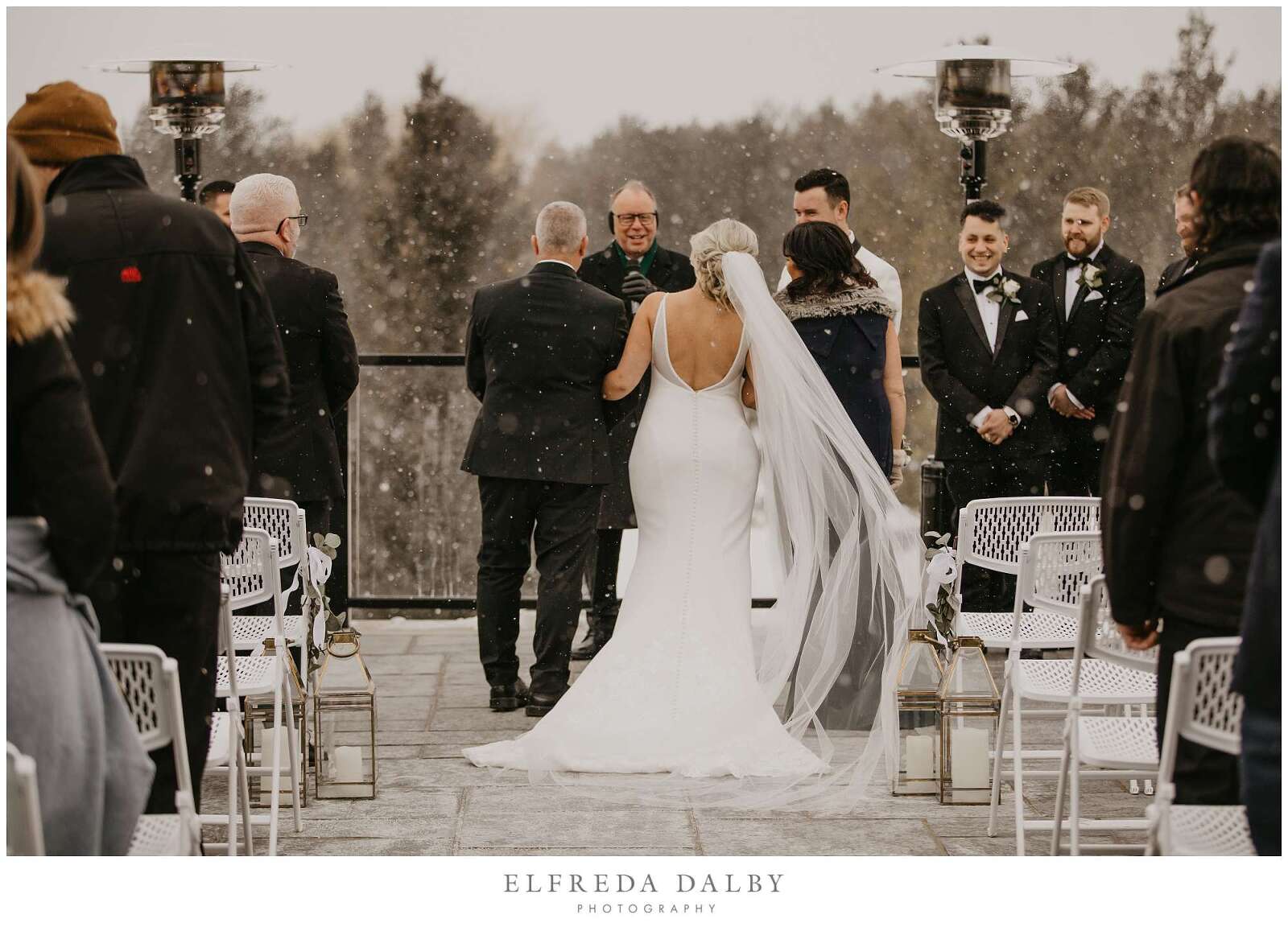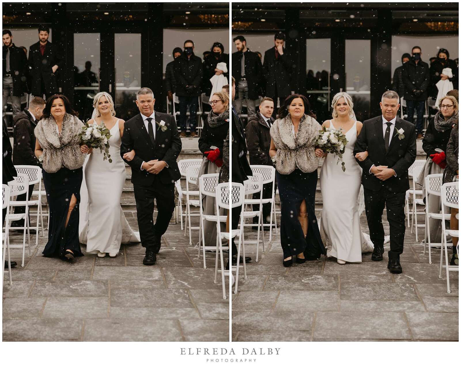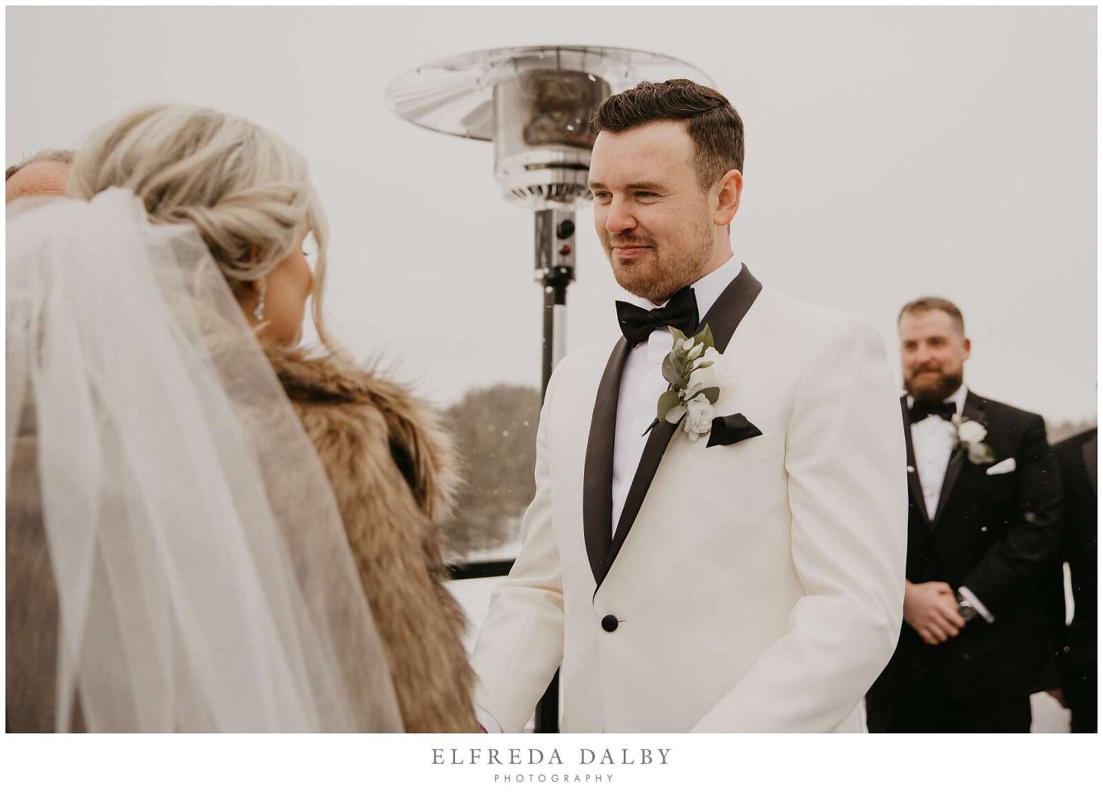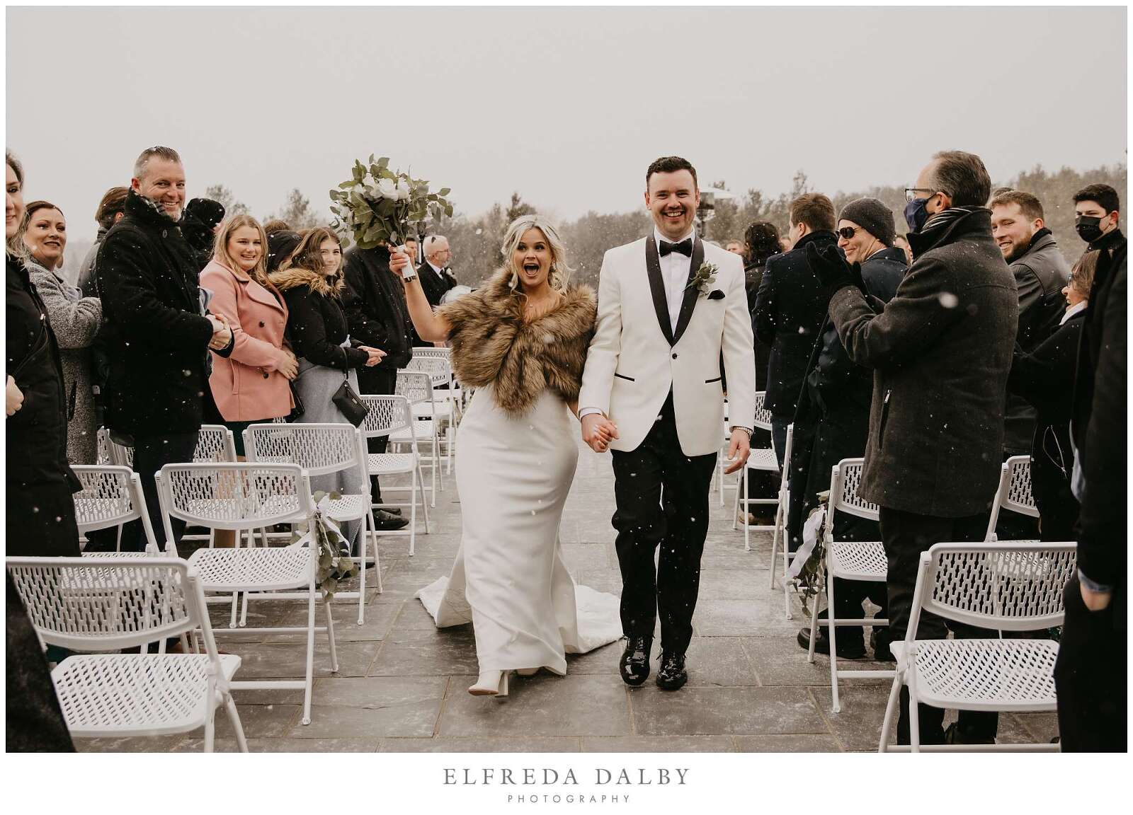 On Kaitlyn and Nolan’s wedding day, Monthill looked like a winter dream. The air was crisp and cold, but that didn’t stop them from having an outdoor ceremony on the terrace. Giant patio heaters and cozy coats made it comfortable for everyone. Just as they exchanged vows, soft snow began to fall. It added a special romantic touch, giving them the winter wedding they had envisioned.