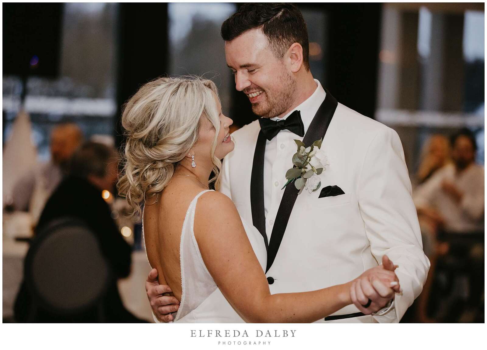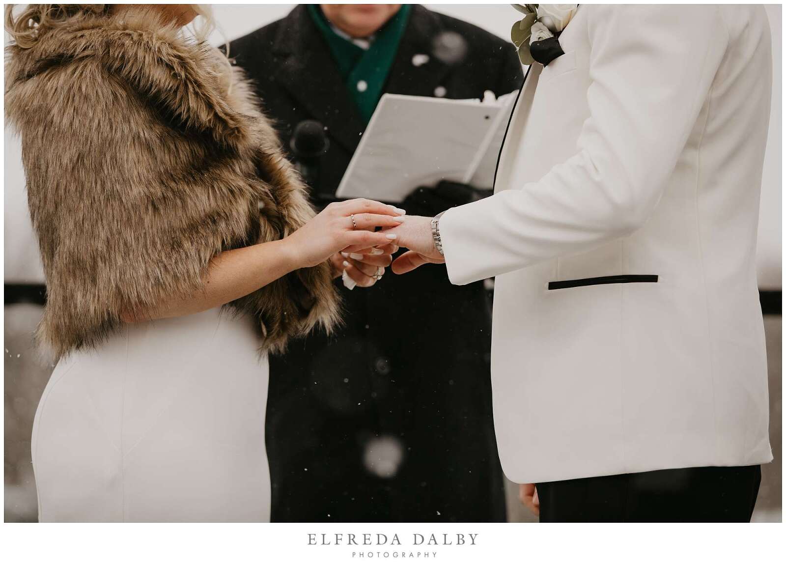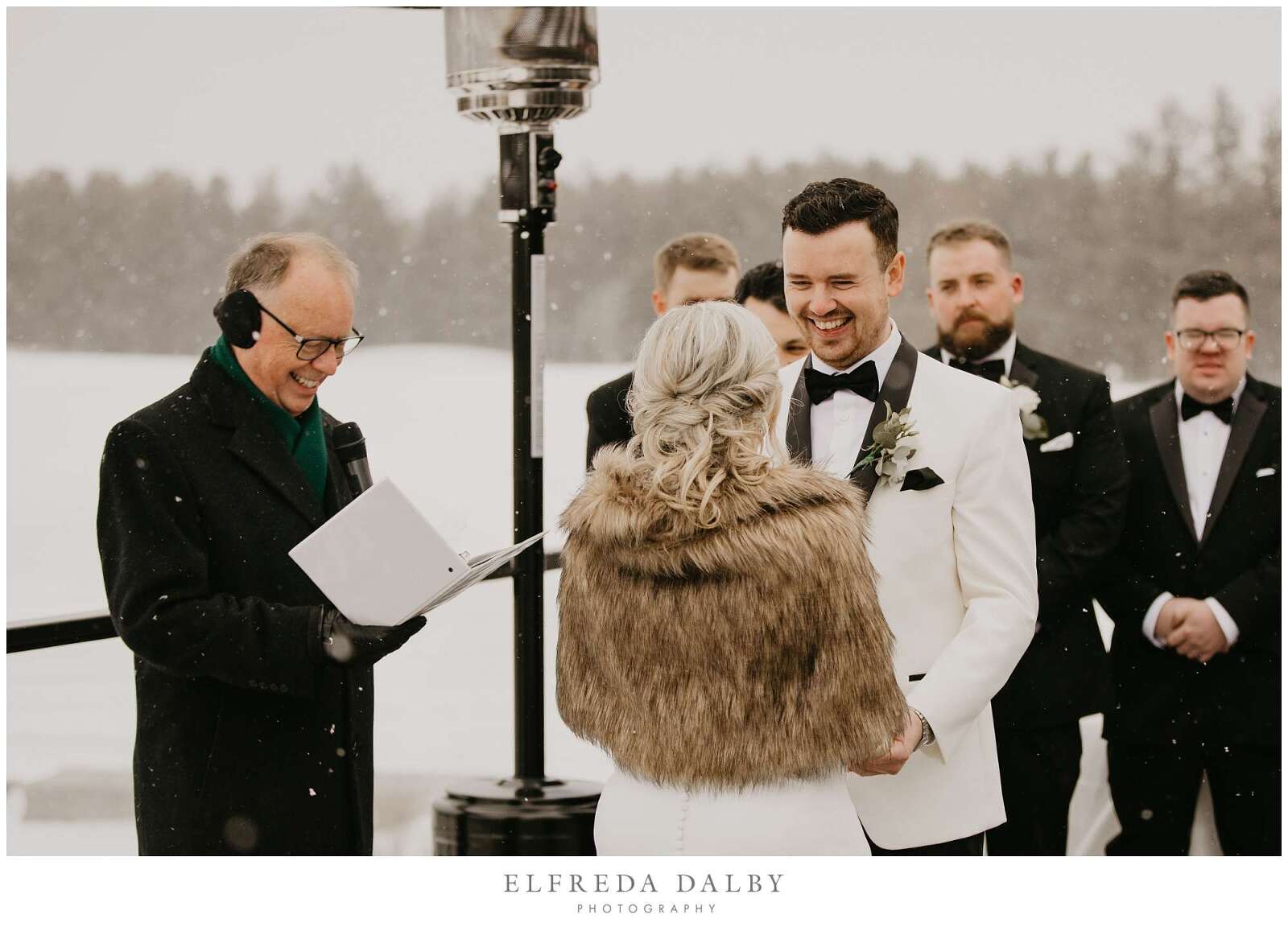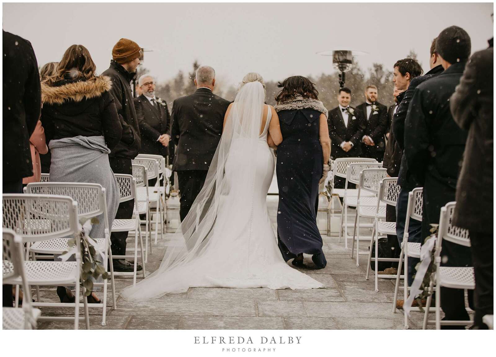 On Kaitlyn and Nolan’s wedding day, Monthill looked like a winter dream. The air was crisp and cold, but that didn’t stop them from having an outdoor ceremony on the terrace. Giant patio heaters and cozy coats made it comfortable for everyone. Just as they exchanged vows, soft snow began to fall. It added a special romantic touch, giving them the winter wedding they had envisioned.