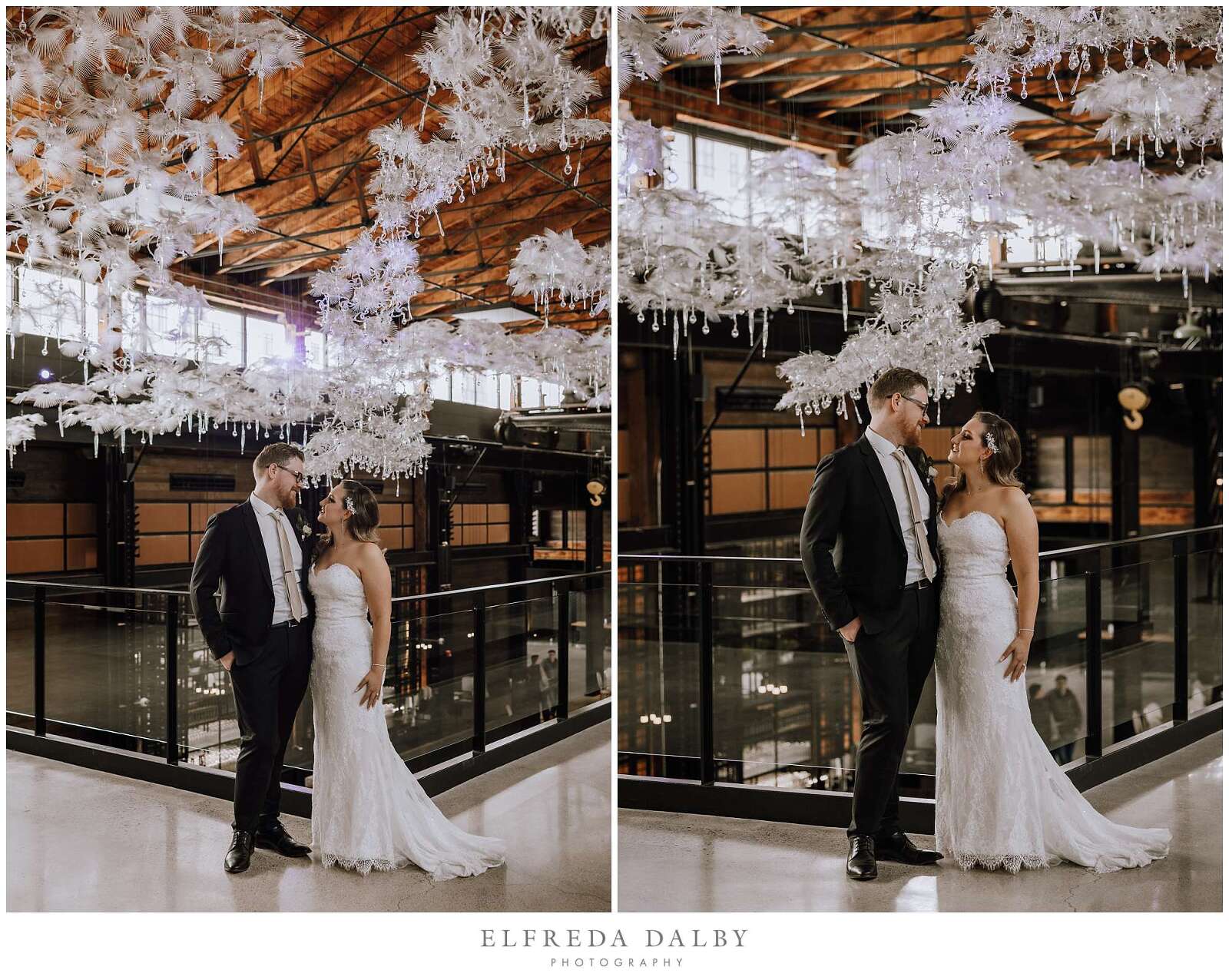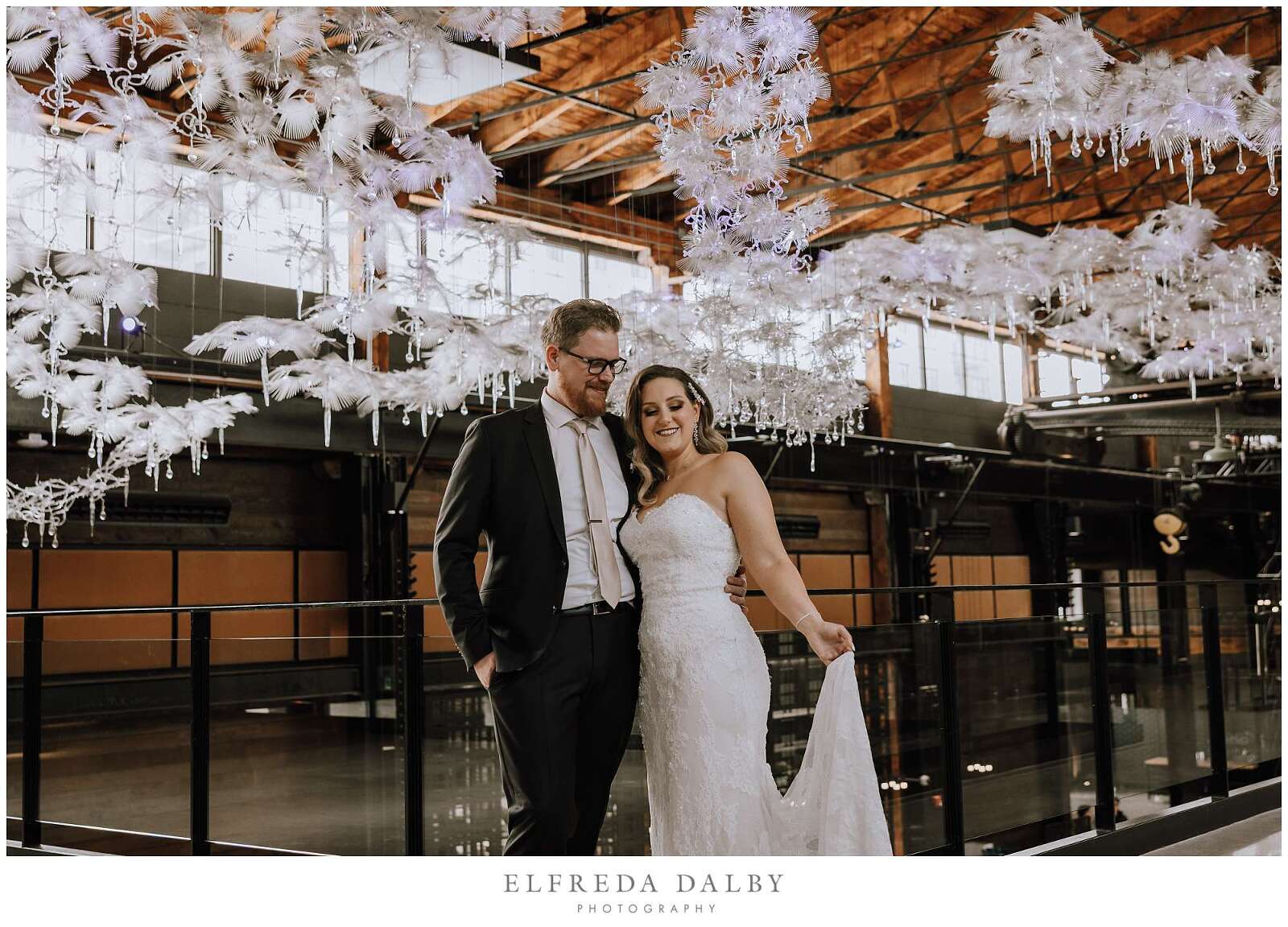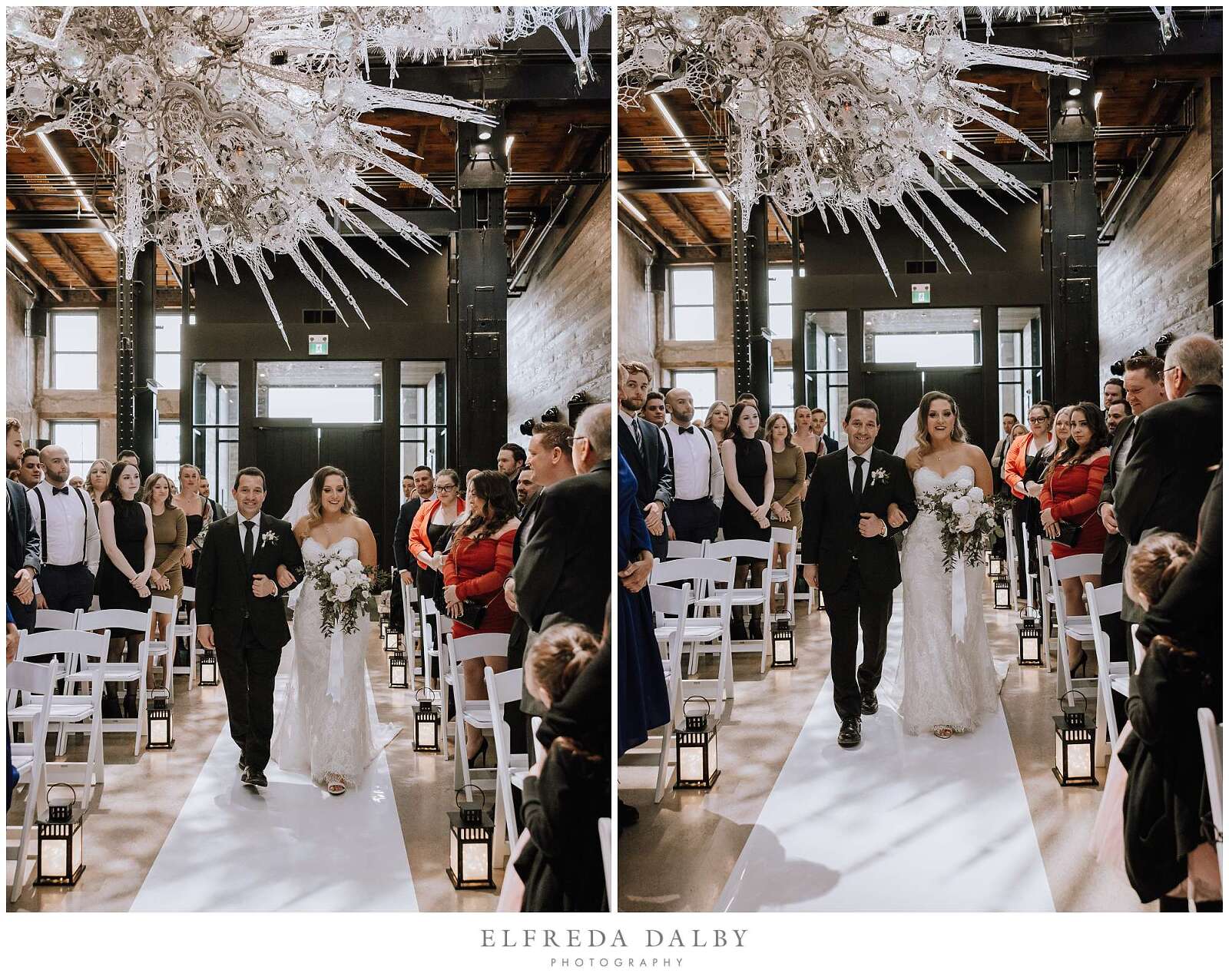 Brooke and Kyle said their I do’s and celebrated their wedding day at Tapestry Hall in Cambridge, Ontario. Tapestry Hall is an historic heritage building that is now a modern wedding venue and event space in the trendy Gaslight District of Cambridge. Outdoor weddings in Ontario in February are like Maple Leaf playoff wins, they don’t happen very often. Thankfully there are stunning wedding venues perfect for winter weddings like Tapestry Hall. When choosing a winter wedding venue, it’s always a good idea to pick one that has options for taking your photos inside where it is toasty warm and very comfortable. Tapestry Hall has tons of spots for doing your portraits inside – bride and groom portraits, family portraits and bridal party portraits. There is plenty of open space to be able to do larger bridal party portraits and family portraits. You won’t have to venture out into the cold at all if you don’t want to because there every corner really is camera ready inside Tapestry Hall.